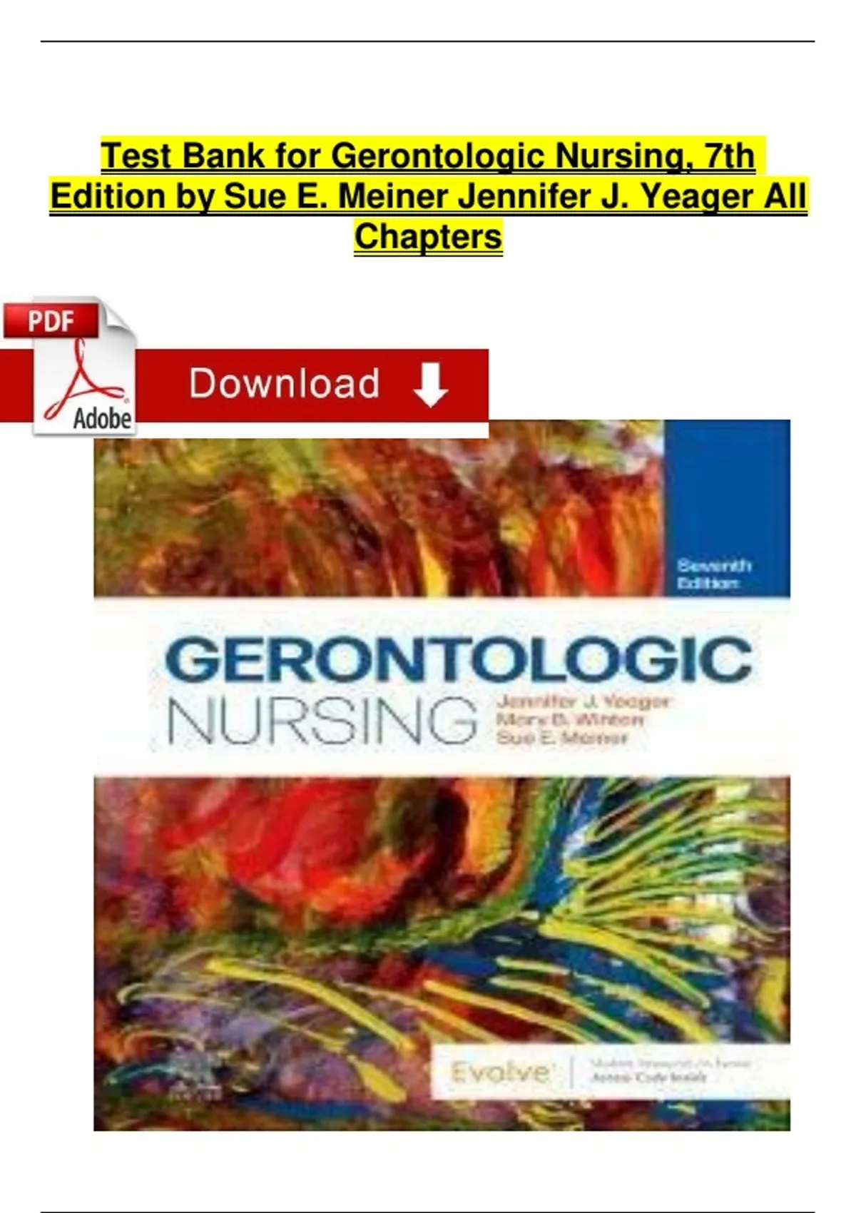 This document contains the complete test bank for Gerontologic Nursing (7th Edition) by Sue E. Meiner and Jennifer J. Yeager. It provides exam-style questions and answers for all chapters, covering key topics in gerontologic nursing, aging processes, health promotion, and care strategies for older adults. A valuable resource for nursing students preparing for quizzes, exams, and clinical practice assessments.