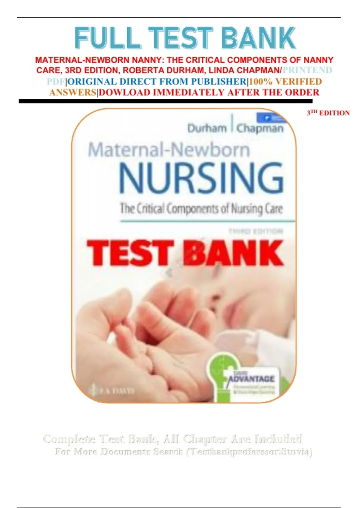 TEST BANK FOR MATERNAL-NEWBORN NANNY: THE CRITICAL COMPONENTS OF NANNY CARE, 3RD EDITION, ROBERTA DURHAM, LINDA CHAPMAN