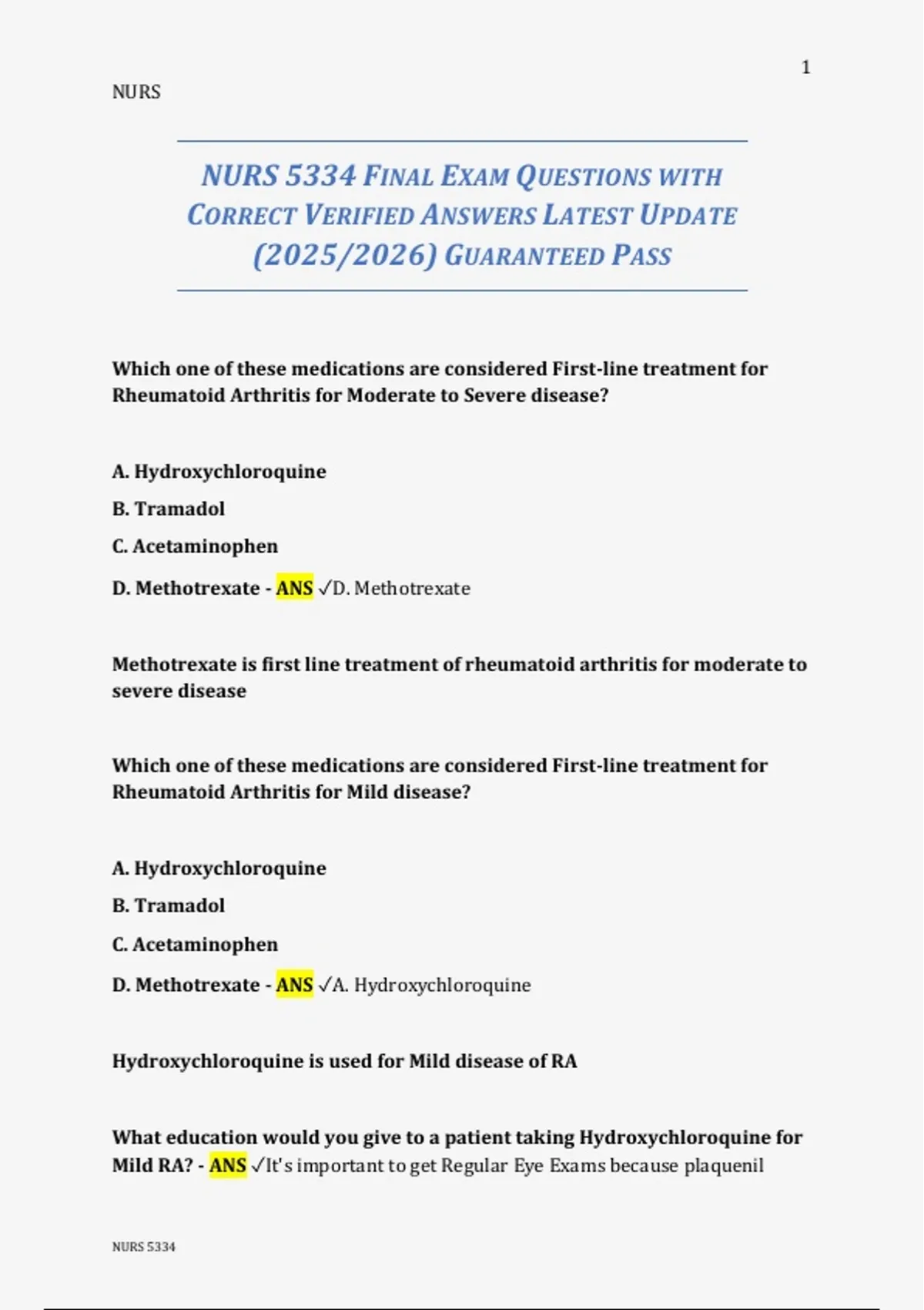 D. Methotrexate - ANS ✓A. Hydroxychloroquine