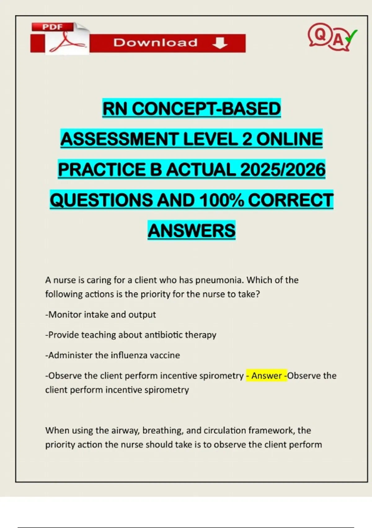 RN CONCEPT-BASED ASSESSMENT LEVEL 2 ONLINE PRACTICE B ACTUAL 2025/2026 QUESTIONS AND 100% CORRECT ANSWERS A nurse is caring for a client who has pneumonia. Which of the following actions is the priority for the nurse to take? -Monitor intake and output -Provide teaching about antibiotic therapy -Administer the influenza vaccine -Observe the client perform incentive spirometry - Answer -Observe the client perform incentive spirometry When using the airway, breathing, and circulation framework, the priority action the nurse should take is to observe the client performNeed assistance on Online classes, Exams & Assignments? Reach out for instant help!! Full Course Assistance, Plagiarism-free Essay Writing, Research Paper, Dissertation, Discussion Posts, etc…. Confidential & Secure services. Tutors are available for all subjects! Email now at: incentive spirometry. Incentive spirometry improves gas exchange and oxygenation and stimulates coughing, which assists in clearing secretions. A nurse is assessing a client who has hyperthyroidism and has been taking methimazole for 6 months. Which of the following findings indicates a therapeutic response to the medication -The client's skin is warm and moist -The client reports sleeping longer during the night -The client is experiencing increased bowel movements -The client's weight is 1.4 kg (3.1 lb) less than baseline - Answer -The client reports sleeping longer during the night The nurse should recognize that insomnia is a manifestation of hyperthyroidism. The client's ability to sleep longer during the night indicates a therapeutic response to the medication. A nurse is planning discharge teaching for the guardian of a child who had a cardiac catheterization. Which of the following instructions should the nurse include?-Monitor the site daily for drainage -Leave the pressure dressing on the 48 hr -Administer aspirin if the child reports pain -Resume tub baths in 24hr - Answer -Monitor the site daily for drainage The nurse should instruct the guardian to monitor the site daily
