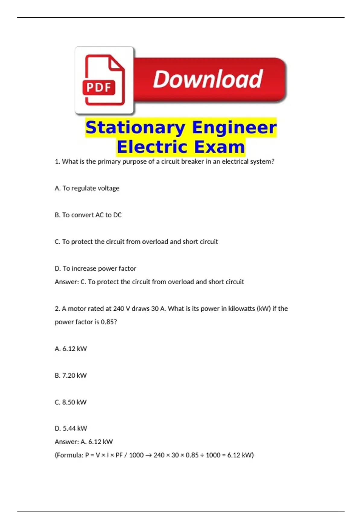 (Formula: P = V × I × PF / 1000 → 240 × 30 × 0.85 ÷ 1000 = 6.12 kW)