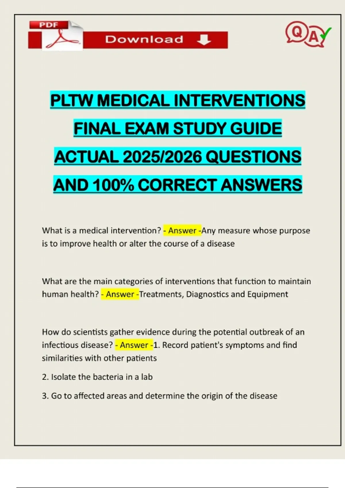 PLTW MEDICAL INTERVENTIONS FINAL EXAM STUDY GUIDE ACTUAL 2025/2026 QUESTIONS AND 100% CORRECT ANSWERS What is a medical intervention? - Answer -Any measure whose purpose is to improve health or alter the course of a disease What are the main categories of interventions that function to maintain human health? - Answer -Treatments, Diagnostics and Equipment How do scientists gather evidence during the potential outbreak of an infectious disease? - Answer -1. Record patient's symptoms and find similarities with other patients 2. Isolate the bacteria in a lab 3. Go to affected areas and determine the origin of the diseaseNeed assistance on Online classes, Exams & Assignments? Reach out for instant help!! Full Course Assistance, Plagiarism-free Essay Writing, Research Paper, Dissertation, Discussion Posts, etc…. Confidential & Secure services. Tutors are available for all subjects! Email now at: 4. Identify the disease using DNA sequencing since pathogens alter certain DNA sequences What is bioinformatics? - Answer -The collection, classification, storage, and analysis of biochemical and biological information using computers. (Especially applied in molecular genetics and genomics) How can DNA sequences be used to ide