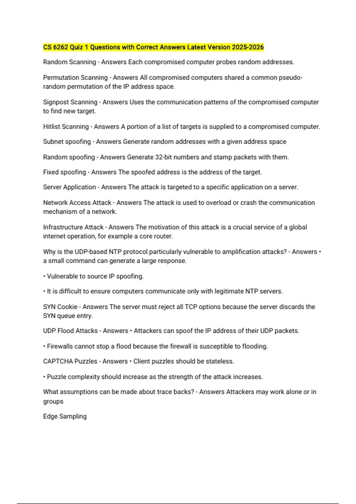 CS 6262 Quiz 1 Questions with Correct Answers Latest Version Random Scanning - Answers Each compromised computer probes random addresses. Permutation Scanning - Answers All compromised computers shared a common pseudo-random permutation of the IP address space. Signpost Scanning - Answers Uses the communication patterns of the compromised computer to find new target. Hitlist Scanning - Answers A portion of a list of targets is supplied to a compromised computer. Subnet spoofing - Answers Generate random addresses with a given address space Random spoofing - Answers Generate 32-bit numbers and stamp packets with them. Fixed spoofing - Answers The spoofed address is the address of the target. Server Application - Answers The attack is targeted to a specific application on a server. Network Access Attack - Answers The attack is used to overload or crash the communication mechanism of a network. Infrastructure Attack - Answers The motivation of this attack is a crucial service of a global internet operation, for example a core router. Why is the UDP-based NTP protocol particularly vulnerable to amplification attacks? - Answers • a small command can generate a large response. • Vulnerable to source IP spoofing. • It is difficult to ensure computers communicate only with legitimate NTP servers. SYN Cookie - Answers The server must reject all TCP options because the server discards the SYN queue entry. UDP Flood Attacks - Answers • Attackers can spoof the IP address of their UDP packets. • Firewalls cannot stop a flood because the firewall is susceptible to flooding. CAPTCHA Puzzles - Answers • Client puzzles should be stateless. • Puzzle complexity should increase as the strength of the attack increases. What assumptions can be made about trace backs? - Answers Attackers may work alone or in groups Edge Sampling What assumptions can be made regarding edge sampling? - Answers • Multiple attackers can be identified since edge identifies splits in reverse path. • Requires space in the IP packet header. Reflector Attacks Self defense against reflector attacks should incorporate the following: - Answers • Server redundancy - servers should be located in multiple networks and locations. • Traffic limiting - traffic from a name server should be limited to reasonable thresholds. Deep Web - Answers It is not indexed by standard search engines Dark Web - Answers Web content that exists on darknets Surface Web - Answers Readily available to the public, and searchable with standard search engines. Doorway pages - Answers A webpage that lists many keywords, in hopes of increasing search engine ranking. Scripts on the page redirect to the attackers page. Crypters - Answers A program that hides malicious code from anti-virus software. Blackhat Search Engine Optimizer - Answers It increases traffic to the attacker's site by manipulating search engines. Trojan Download Manager - Answers Software that allows an attacker to update or install malware on a victim's computer. Name two identifying characteristics of Spam: - Answers 1) Inappropriate or irrelevant 2) Large number of recipients Name the top three countries where spam directed visitors added items to their shopping carts: - Answers 1) United States 2) Canada 3) Philippines Which events should trigger a penetration test? • Infastructure is added or modified • Applications are added of modified • End user policies are changed • Security patches are installed - Answers • Infastructure is added or modified