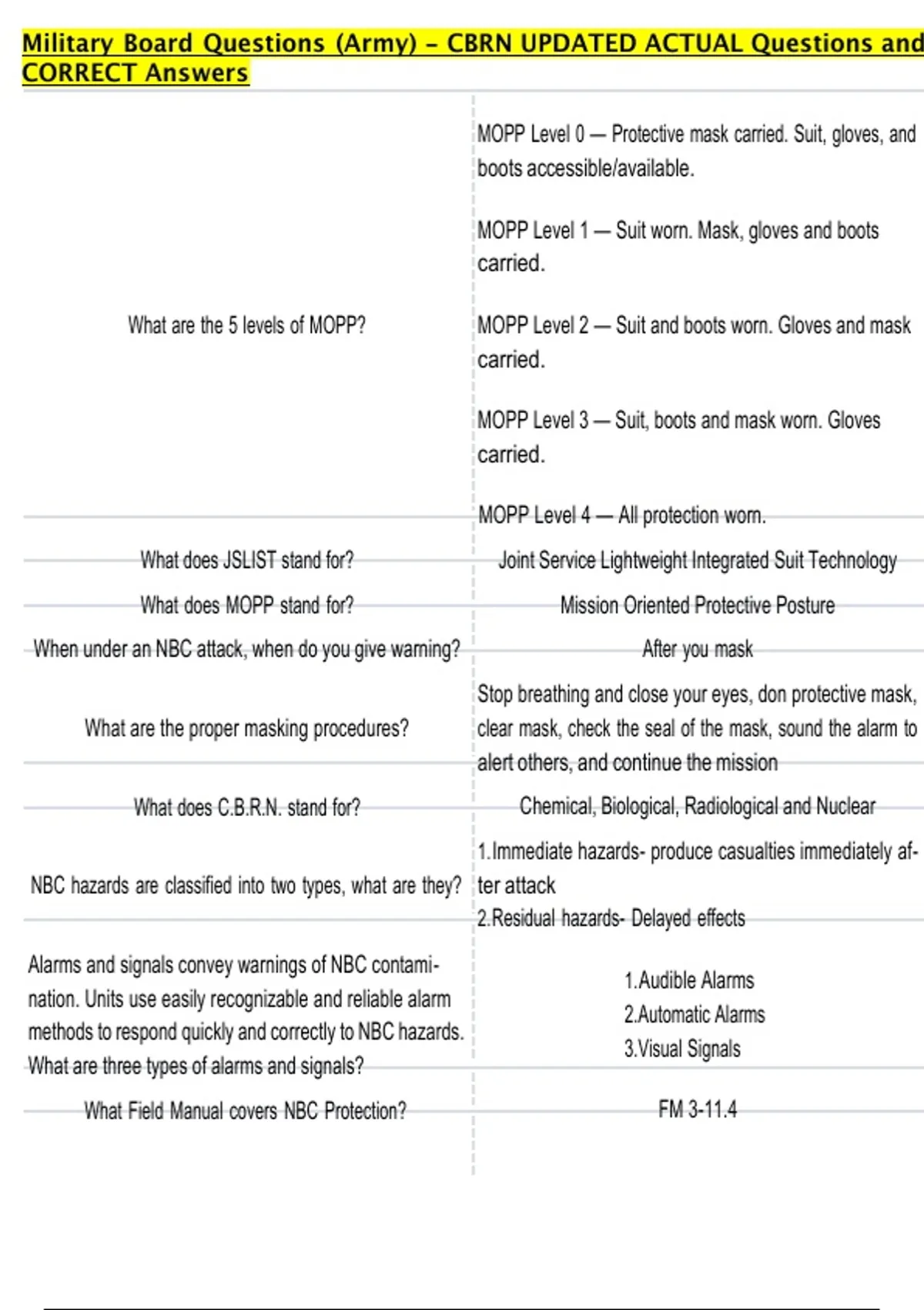 Military Board Questions (Army) – CBRN UPDATED ACTUAL Questions and