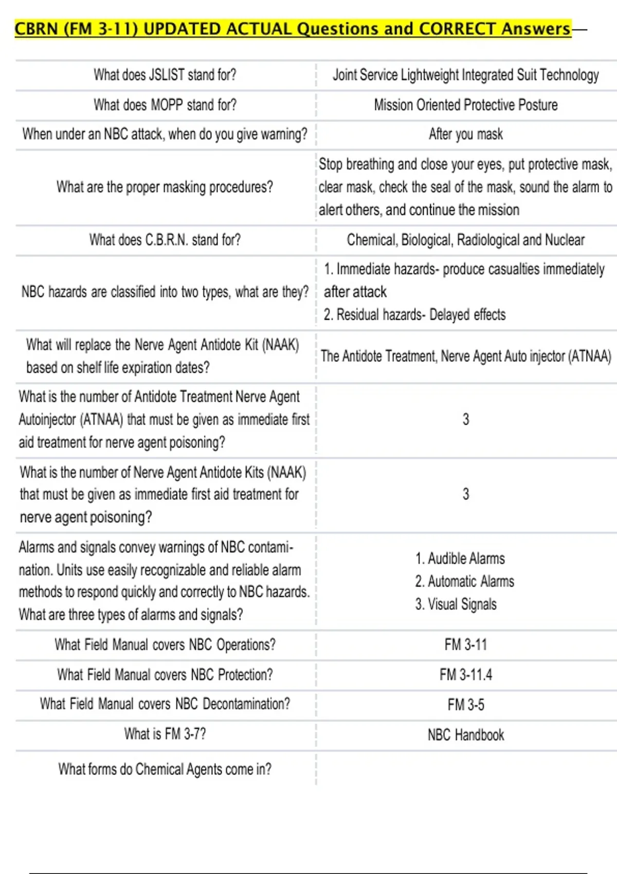 CBRN (FM 3-11) UPDATED ACTUAL Questions and CORRECT Answers