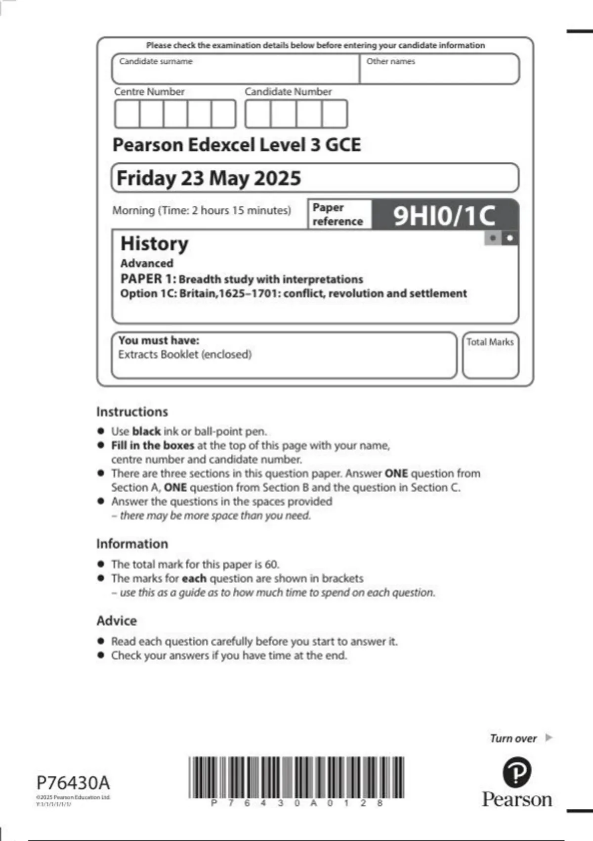 Pearson Edexcel Level 3 GCE 9HI0/1C History Advanced PAPER 1: Breadth study with interpretations Option 1C: Britain,: conflict, revolution and settlement June 2025