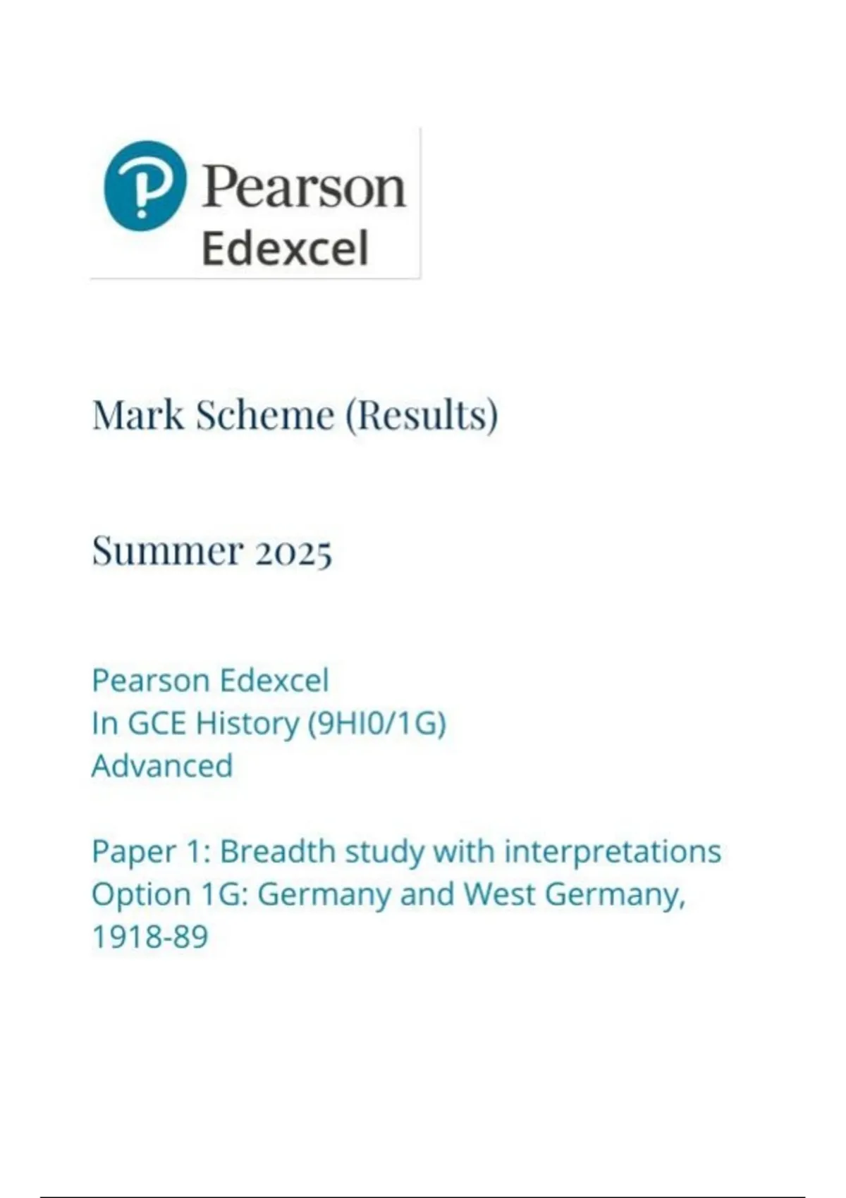 Pearson Edexcel In GCE History (9HI0/1G) Advanced Paper 1: Breadth study with interpretations Option 1G: Germany and West Germany, 1918-89 Question paper and marking scheme June 2025