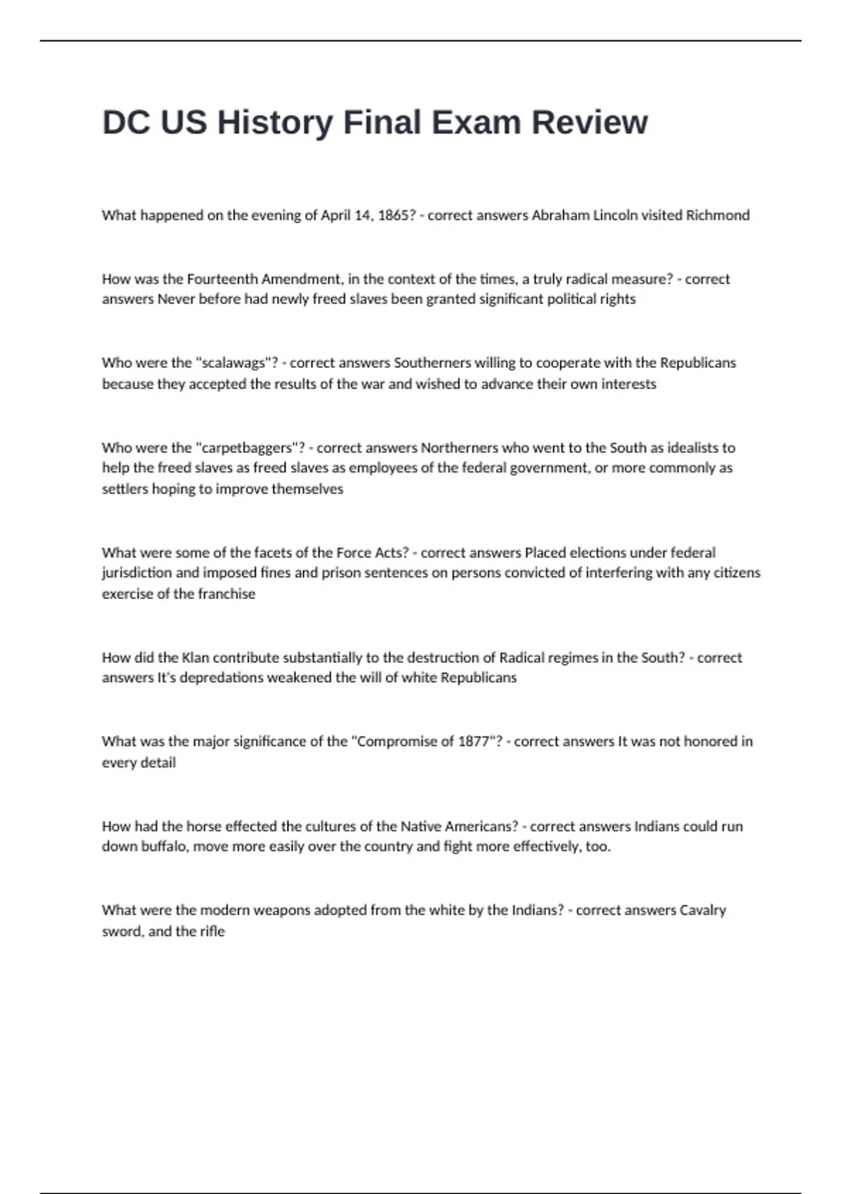 DC US History Final Exam Review Questions And Correctly Well Defined Answers.