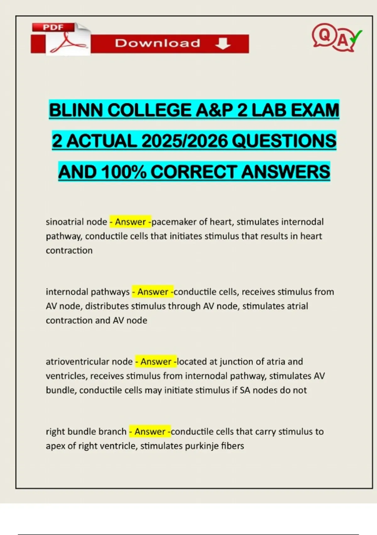 BLINN COLLEGE A&P 2 LAB EXAM 2 ACTUAL 2025/2026 QUESTIONS AND 100% CORRECT ANSWERS sinoatrial node - Answer -pacemaker of heart, stimulates internodal pathway, conductile cells that initiates stimulus that results in heart contraction internodal pathways - Answer -conductile cells, receives stimulus from AV node, distributes stimulus through AV node, stimulates atrial contraction and AV node atrioventricular node - Answer -located at junction of atria and ventricles, receives stimulus from internodal pathway, stimulates AV bundle, conductile cells may initiate stimulus if SA nodes do not right bundle branch - Answer -conductile cells that carry stimulus to apex of right ventricle, stimulates purkinje fibersNeed assistance on Online classes, Exams & Assignments? Reach out for instant help!! Full Course Assistance, Plagiarism-free Essay Writing, Research Paper, Dissertation, Discussion Posts, etc…. Confidential & Secure services. Tutors are available for all subjects! Email now at: Purkinje fibers - Answer -network in right and left ventricle walls, conductile cells that carry stimulus to ventricular cardiac muscle cells Interatrial Node - Answer -conductile cells, branch of internodal tract, located on inner wall of left atrium, receives stimulus from SA node, stimulates atrial contraction intertrial node is also known as