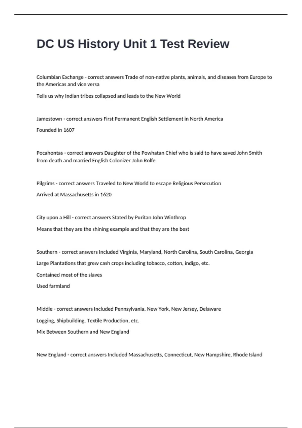 Pilgrims - correct answers Traveled to New World to escape Religious Persecution