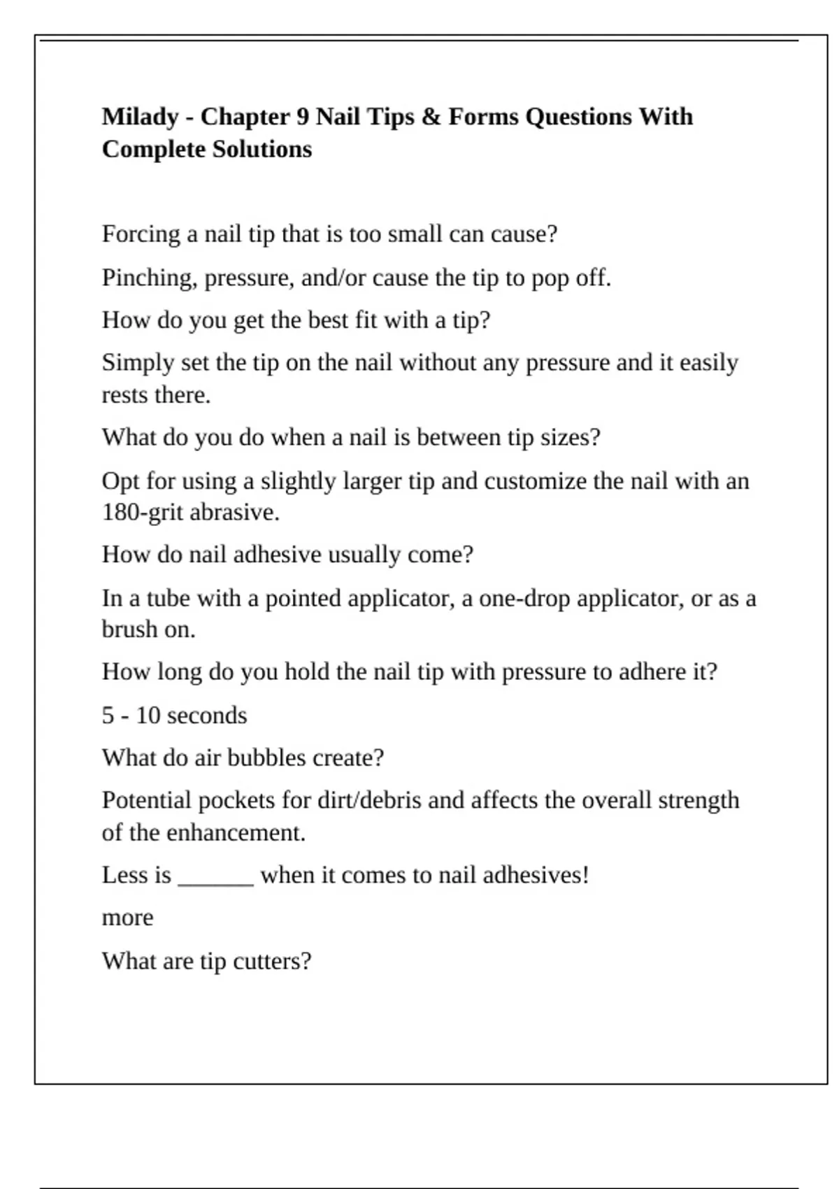 Milady - Chapter 9 Nail Tips & Forms Questions With Complete Solutions