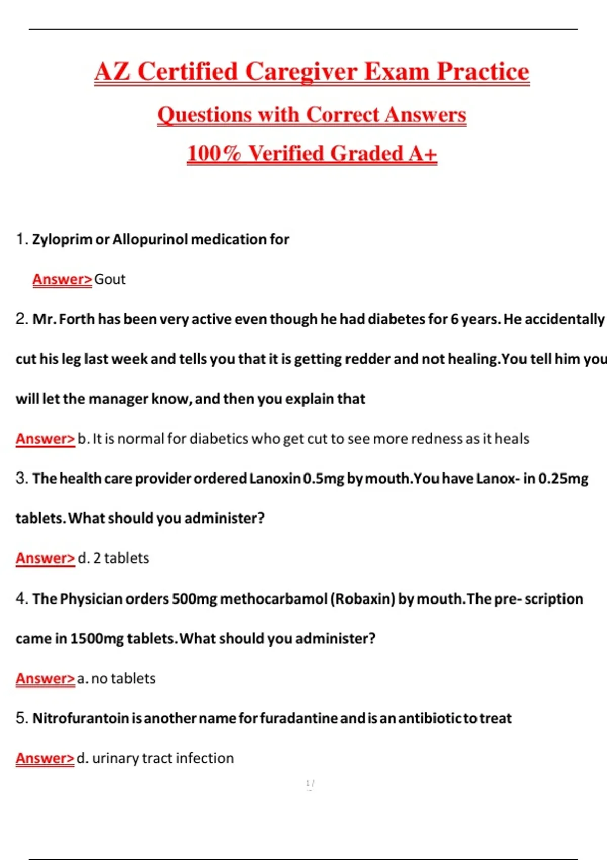 AZ Certified Caregiver Exam Practice Questions and Guide Answers (Latest 2026/2027 Update), 100% Verified Graded A+ Prepare with confidence for your Arizona Certified Caregiver Exam using this comprehensive 2026 practice guide — the ultimate resource for aspiring caregivers, CNAs, and home health aides in Arizona. Designed by experienced healthcare educators, this guide offers realistic exam-style questions, detailed rationales, and up-to-date caregiver knowledge aligned with Arizona Board of Nursing Care Institution Administrators & Assisted Living Facility Managers (NCIA Board) standards. Whether you’re preparing for initial certification or renewal, this all-inclusive AZ Certified Caregiver Exam Practice Guide helps you master every topic tested — from resident rights, infection control, medication management, to end-of-life care. Each section is written in simple, clear language that reinforces both state regulations and best caregiving practices. This is not just a question bank — it’s your step-by-step roadmap to passing the Arizona Caregiver Exam on your first try and becoming a confident, compassionate, and skilled professional in elder and assisted living care. Core Topics Covered: Arizona Caregiver Certification Requirements Resident Rights and Ethics in Caregiving Communication and Documentation Basic Anatomy and Physiology Infection Control and Universal Precautions Medication Assistance and Safety Nutrition and Meal Preparation Mental Health and Cognitive Impairment Dementia and Alzheimer’s Care End-of-Life and Hospice Care Emergency Procedures and First Aid Mobility, Transfers, and Positioning Personal Care: Bathing, Dressing, Grooming Abuse, Neglect, and Reporting Protocols Legal Responsibilities and Confidentiality (HIPAA) Cultural Sensitivity and Person-Centered Care Why This AZ Caregiver Exam Guide Stands Out: Written by Certified Arizona Instructors – Aligned with state exam content and caregiving standards. Updated for 2026 Regulations – Reflects the most current laws and training frameworks. Comprehensive Yet Easy to Understand – Designed for quick learning and maximum retention. Perfect for First-Time Test Takers or Recertification – All levels welcome. Practical Care Scenarios Included – Strengthens clinical reasoning and judgment. Proven Success Formula – Used by hundreds of caregivers, nursing assistants, and home care providers statewide. ‍⚕️ Who This Is For: Individuals preparing for the Arizona Certified Caregiver Exam Students in caregiver training programs Home health aides, personal care assistants, and CNAs seeking Arizona certification Assisted living and memory care staff advancing their careers Nursing instructors and training centers seeking reliable test prep materials Healthcare professionals relocating to Arizona and meeting state requirements Your Complete Path to Caregiver Certification Success: This AZ Certified Caregiver Exam Practice Guide is your trusted partner in achieving professional success in caregiving. Designed to simulate the real testing experience, it builds the knowledge, confidence, and skills required to pass the Arizona caregiver exam with ease. Each section reinforces hands-on care principles, legal standards, and resident safety, helping you not only pass the test but also excel in daily caregiving responsibilities. With this guide, you’ll be fully prepared to deliver compassionate, high-quality care in any assisted living, residential, or home care setting. AZ Certified Caregiver Exam, Arizona Caregiver Exam Practice, Arizona Certified Caregiver Study Guide, AZ Caregiver Certification Test Prep, Arizona Caregiver Exam Questions and Answers, Arizona Caregiver Training Book, Arizona Caregiver Exam Practice Test, Arizona Certified Caregiver Practice Guide, AZ Caregiver Certification 2026, Arizona Caregiver Review Book, AZ Caregiver Study Material, Arizona Assisted Living Caregiver Exam, Caregiver Exam Arizona, Arizona Caregiver Training Practice Test, AZ Certified Caregiver Review, Arizona Caregiver Final Exam, AZ Caregiver Practice Questions, Arizona Caregiver Training Program, Arizona Caregiver Exam Prep Book, Certified Caregiver Test Arizona, Caregiver Exam Questions Arizona, Arizona Home Health Aide Exam, Arizona Caregiver Skills Test, Caregiver Certification Arizona, Arizona Caregiver 2026 Exam
