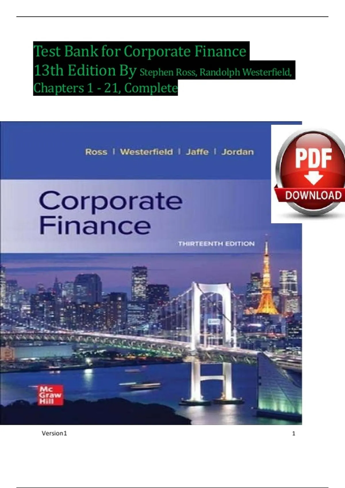 Master the core concepts of finance with the Test Bank for Corporate Finance, 13th Edition by Stephen Ross and Randolph Westerfield, covering Chapters 1–21 in full. This complete and up-to-date test bank includes hundreds of carefully crafted multiple-choice questions, true/false statements, and short-answer problems that align directly with each chapter of the textbook. Whether you're a student preparing for exams or an instructor designing quizzes and tests, this resource offers a solid foundation for understanding financial decision-making, capital budgeting, risk analysis, cost of capital, and more. All questions are accurate, clear, and structured to reinforce both theoretical and practical knowledge. Use this trusted study tool to increase confidence, improve grades, and gain a deeper grasp of essential corporate finance principles.