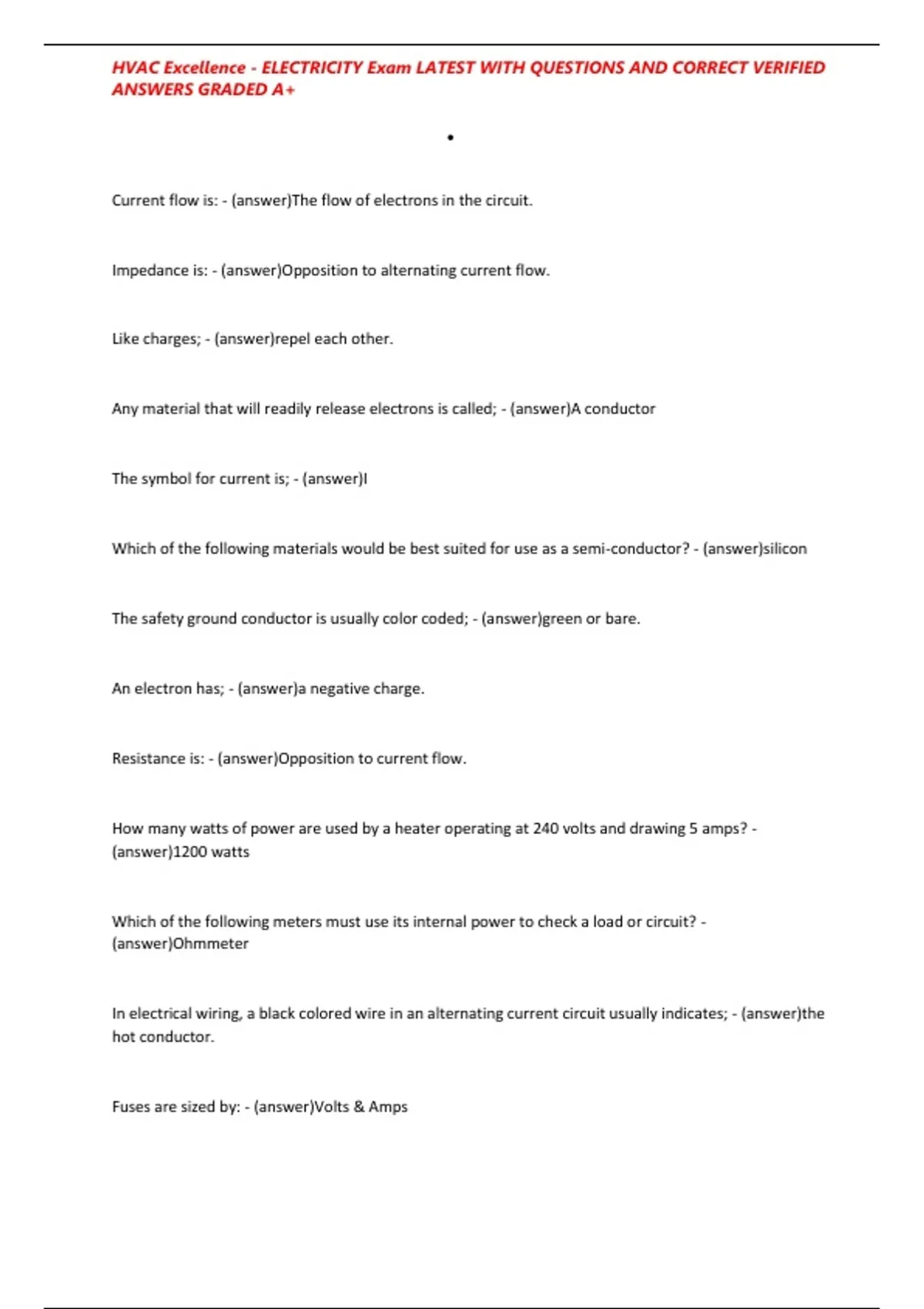 , HVAC Excellence - ELECTRICITY Exam LATEST WITH QUESTIONS AND CORRECT VERIFIED