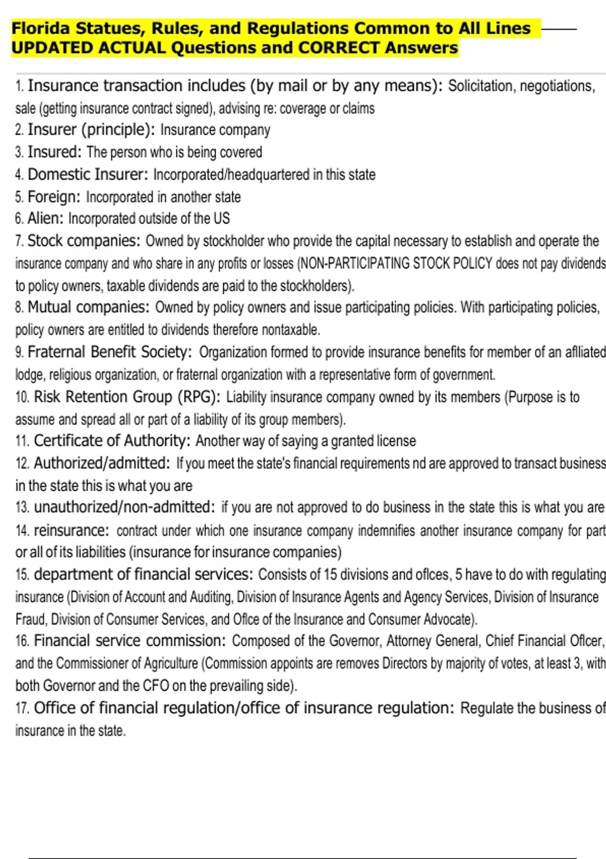 Florida Statues, Rules, and Regulations Common to All Lines UPDATED ACTUAL Questions and CORRECT Answers