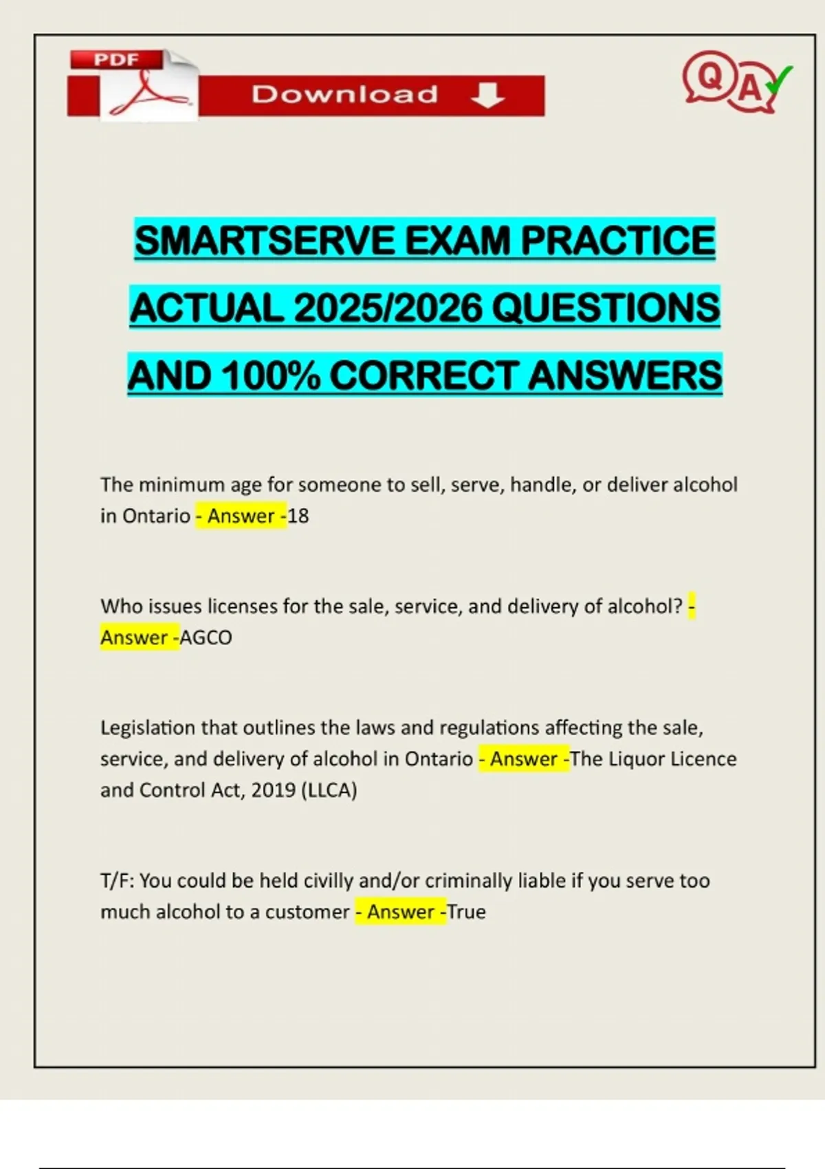 SMARTSERVE EXAM PRACTICE ACTUAL 2025/2026 QUESTIONS AND 100% CORRECT ANSWERS The minimum age for someone to sell, serve, handle, or deliver alcohol in Ontario - Answer -18 Who issues licenses for the sale, service, and delivery of alcohol? - Answer -AGCO Legislation that outlines the laws and regulations affecting the sale, service, and delivery of alcohol in Ontario - Answer -The Liquor Licence and Control Act, 2019 (LLCA) T/F: You could be held civilly and/or criminally liable if you serve too much alcohol to a customer - Answer -TrueNeed assistance on Online classes, Exams & Assignments? Reach out for instant help!! Full Course Assistance, Plagiarism-free Essay Writing, Research Paper, Dissertation, Discussion Posts, etc…. Confidential & Secure services. Tutors are available for all subjects! Email now at: Since alcohol is a ____, it ______ the central nervous system and impacts how a person thinks, acts, and moves - Answer -depressant; slows the amount of alcohol in the bloodstream - Answer -blood alcohol concentration (BAC) Alcohol is metabolized ____ than it is absorbed - Answer -more slowly What % of alcohol content is eliminated from the bloodstream - Answer -90%