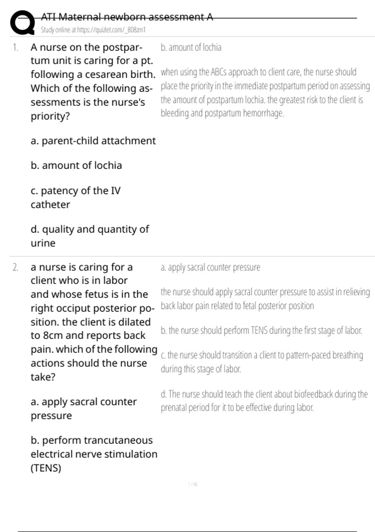 1. A nurse on the postpar- b. amount of lochia