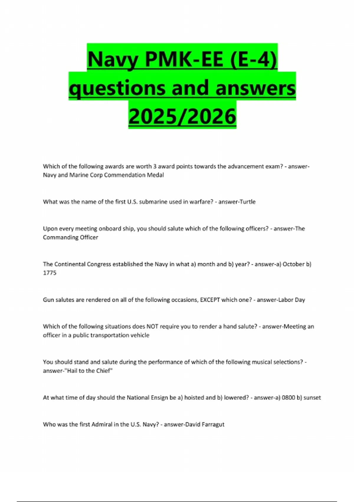 Navy PMK-EE (E-4) questions and answers 2025/2026 Which of the following awards are worth 3 award points towards the advancement exam? - answerNavy and Marine Corp Commendation Medal What was the name of the first U.S. submarine used in warfare? - answer-Turtle Upon every meeting onboard ship, you should salute which of the following officers? - answer-The Commanding Officer The Continental Congress established the Navy in what a) month and b) year? - answer-a) October b) 1775 Gun salutes are rendered on all of the following occasions, EXCEPT which one? - answer-Labor Day Which of the following situations does NOT require you to render a hand salute? - answer-Meeting an officer in a public transportation vehicle You should stand and salute during the performance of which of the following musical selections? - answer-"Hail to the Chief" At what time of day should the National Ensign be a) hoisted and b) lowered? - answer-a) 0800 b) sunset Who was the first Admiral in the U.S. Navy? - answer-David FarragutOn which of the following Great Lakes did Captain Oliver Hazard Perry defeat a British squadron, cutting British supply lines? - answer-Lake Erie Fleet Admiral Nimitz signed the Japanese surrender in 1945 aboard what ship? - answer-USS MISSOURI