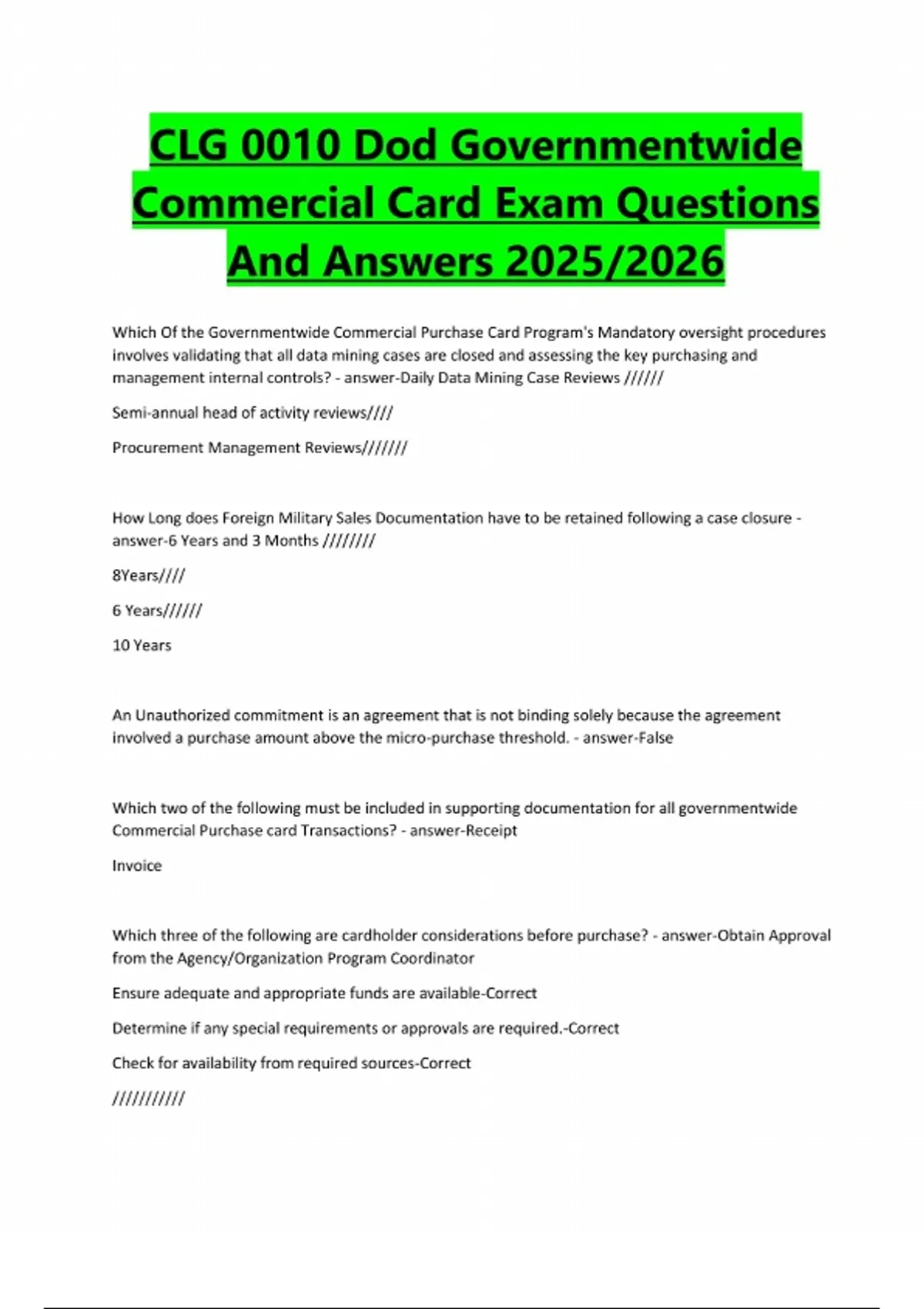CLG 0010 Dod Governmentwide Commercial Card Exam Questions And Answers 2025/2026 Which Of the Governmentwide Commercial Purchase Card Program's Mandatory oversight procedures involves validating that all data mining cases are closed and assessing the key purchasing and management internal controls? - answer-Daily Data Mining Case Reviews ////// Semi-annual head of activity reviews//// Procurement Management Reviews/////// How Long does Foreign Military Sales Documentation have to be retained following a case closure - answer-6 Years and 3 Months //////// 8Years//// 6 Years////// 10 Years An Unauthorized commitment is an agreement that is not binding solely because the agreement involved a purchase amount above the micro-purchase threshold. - answer-False Which two of the following must be included in supporting documentation for all governmentwide Commercial Purchase card Transactions? - answer-Receipt Invoice Which three of the following are cardholder considerations before purchase? - answer-Obtain Approval from the Agency/Organization Program Coordinator Ensure adequate and appropriate funds are available-Correct Determine if any special requirements or approvals are required.-Correct Check for availability from required sources-Correct ///////////