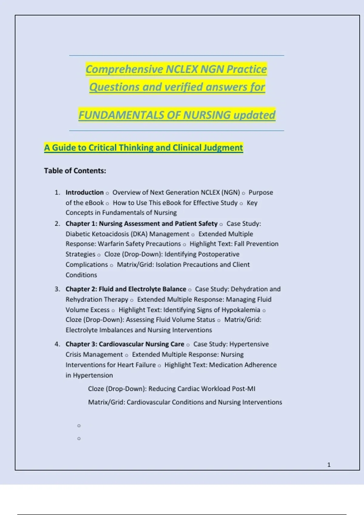 Elevate your NCLEX preparation with this Comprehensive NCLEX NGN Practice Questions & Verified Answers — Fundamentals of Nursing (Updated). This resource features a robust set of practice questions modeled after the Next Generation NCLEX (NGN) format, covering all essential fundamental nursing topics: patient safety, basic care & comfort, health promotion, infection control, mobility, hygiene, elimination, nutrition, documentation, and more. Each question is paired with a verified answer and detailed rationale that explains not only why the correct option is right, but also why other options are less appropriate. This helps you deepen conceptual understanding, sharpen critical thinking, and strengthen exam strategy. Designed for nursing students, NCLEX candidates, and review classes, this comprehensive bank supports both timed practice sessions and targeted topic reviews. Whether you're in your final semester, doing a rigorous study plan, or aiming to refine weak areas, this document is your all-in-one tool for fundamentals mastery. Use it to simulate realistic testing conditions, track your progress, and build confidence heading into test day.