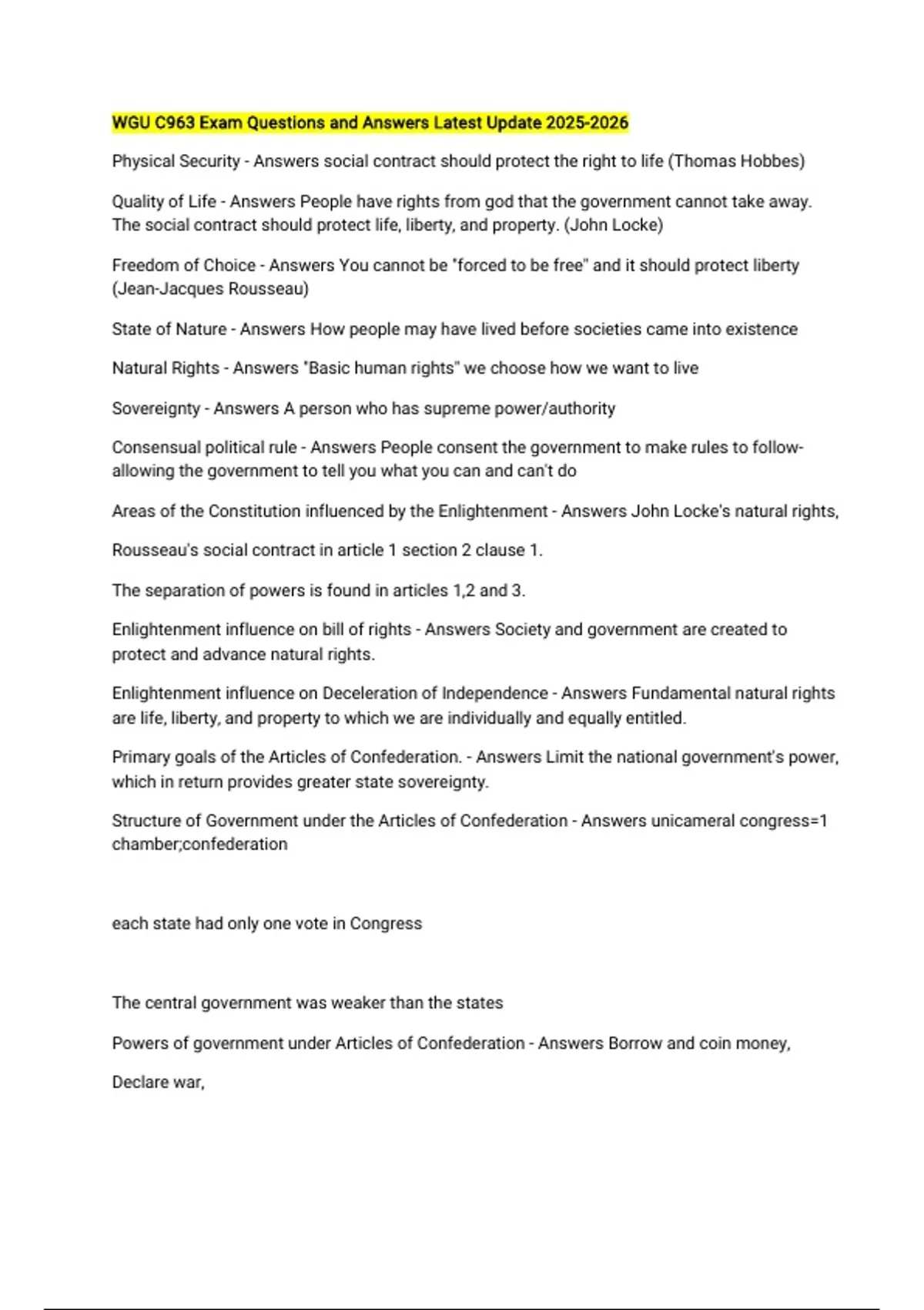 WGU C963 Exam Questions and Answers Latest Update Physical Security - Answers social contract should protect the right to life (Thomas Hobbes) Quality of Life - Answers People have rights from god that the government cannot take away. The social contract should protect life, liberty, and property. (John Locke) Freedom of Choice - Answers You cannot be "forced to be free" and it should protect liberty (Jean-Jacques Rousseau) State of Nature - Answers How people may have lived before societies came into existence Natural Rights - Answers "Basic human rights" we choose how we want to live Sovereignty - Answers A person who has supreme power/authority Consensual political rule - Answers People consent the government to make rules to follow-allowing the government to tell you what you can and can't do Areas of the Constitution influenced by the Enlightenment - Answers John Locke's natural rights, Rousseau's social contract in article 1 section 2 clause 1. The separation of powers is found in articles 1,2 and 3. Enlightenment influence on bill of rights - Answers Society and government are created to protect and advance natural rights. Enlightenment influence on Deceleration of Independence - Answers Fundamental natural rights are life, liberty, and property to which we are individually and equally entitled. Primary goals of the Articles of Confederation. - Answers Limit the national government's power, which in return provides greater state sovereignty. Structure of Government under the Articles of Confederation - Answers unicameral congress=1 chamber;confederation each state had only one vote in Congress The central government was weaker than the states Powers of government under Articles of Confederation - Answers Borrow and coin money, Declare war, Make treaties, Alliance with other nations, Regulate trade with Native Americans, and Settle disputes among other states. Weakness of Article of Confederations - Answers No power to tact or interstate commerce or regulate trade. They could only request money from the state., No national army or navy., No Judicial or executive branches., Each state had one vote regardless of the size of congress; The articles could not be changed without a unanimous vote to do so. New Jersey Plan - Answers Unicameral (one vote per state), State-based (Each state is equally represented), Small states are given the same power as the more significant states in the national legislature, Legislature gave all states one vote each regardless of the population size. Virginia Plan - Answers Bicameral, population based, larger states would have more power than small states and the national legislature, Legislature in what states receive representation based on their population. Major compromises of the constitutional convention - Answers Bicameral Legislature=senate and house reps Two senators regardless of size representation representation in the house would be based upon population elected members of the house=2 years in office appointed to the senate by each state political elite would serve a term of 6 years Three-Fifths Compromise - Answers Satisfied the concerns of the South's concerns over counting their slave population by allowing 60% of the slave population to be counted for State representation and tax purposes. Five slaves=3votes Checks and Balances - Answers A system that allows each government branch to limit the other branches' power to prevent abuse of power. Separation of Powers - Answers The government is separated into three branches: legislative, executive, and judicial. Federalist's Views - Answers Strong government for national defense and economic growth. National currency=government power to create Ability to regulate trade and place tariffs collections of taxes Anti-Federalist's Views - Answers Feared National government and believed in states legislatures