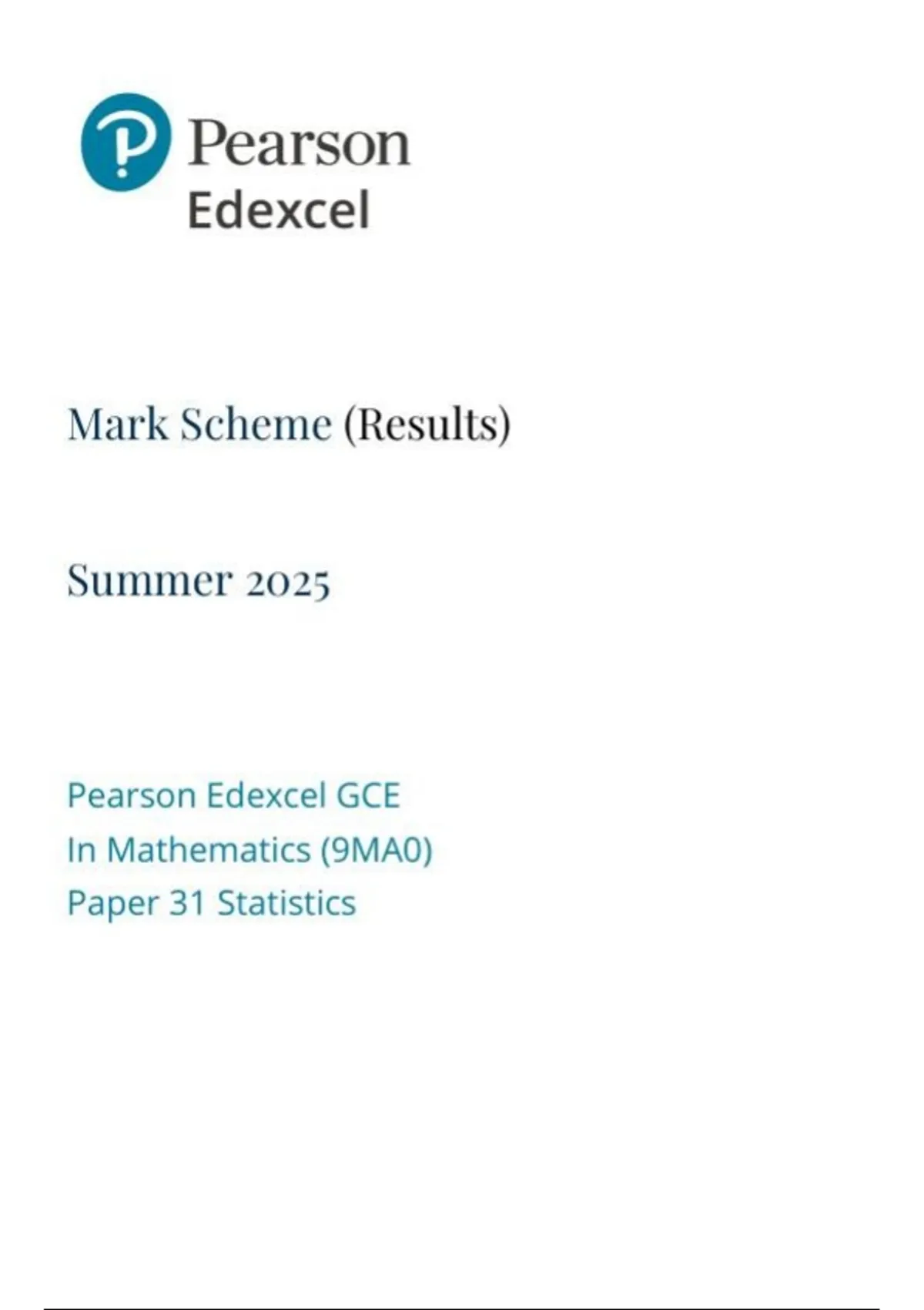 Pearson Edexcel GCE In Mathematics (9MAO) Paper 31 Statistics Marking scheme June 2025