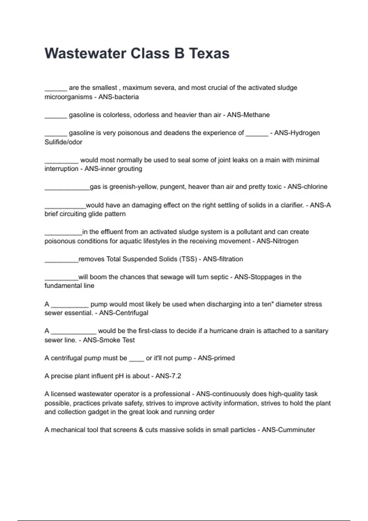 Wastewater Class B Texas NEWEST 2025/2026 ACTUAL EXAM COMPLETE QUESTIONS AND CORRECT DETAILED ANSWERS (VERIFIED ANSWERS) |ALREADY GRADED A+||BRAND NEW!!