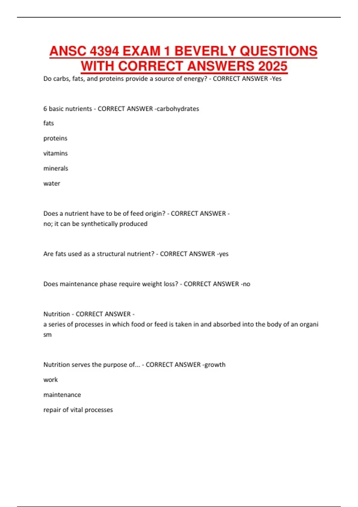 Nutrition - CORRECT ANSWER -