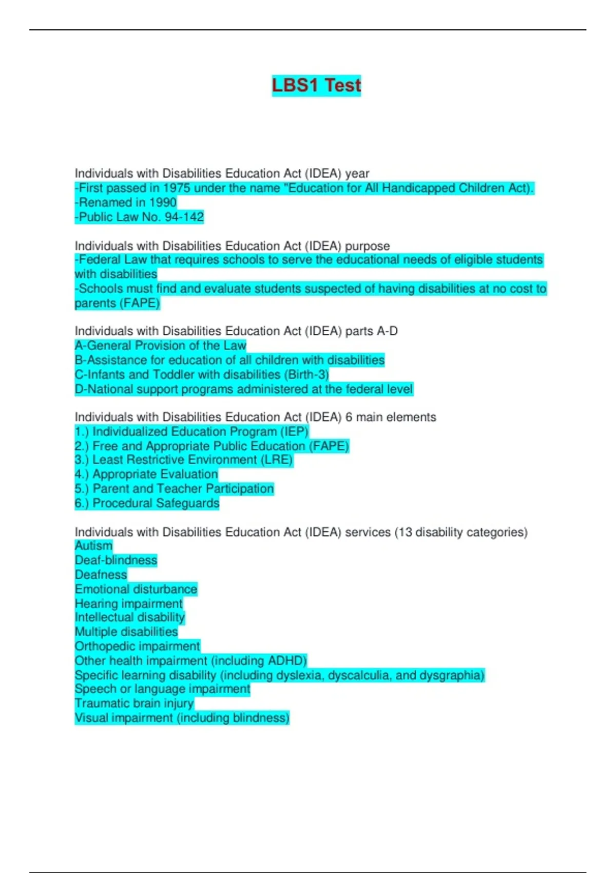 Learning Behavior Specialist I (LBS1) Test | Verified with 100% Correct Answers Individuals with Disabilities Education Act (IDEA) year -First passed in 1975 under the name "Education for All Handicapped Children Act). -Renamed in 1990 -Public Law No. 94-142 Individuals with Disabilities Education Act (IDEA) purpose -Federal Law that requires schools to serve the educational needs of eligible students with disabilities -Schools must find and evaluate students suspected of having disabilities at no cost to parents (FAPE) Individuals with Disabilities Education Act (IDEA) parts A-D A-General Provision of the Law B-Assistance for education of all children with disabilities C-Infants and Toddler with disabilities (Birth-3) D-National support programs administered at the federal level Individuals with Disabilities Education Act (IDEA) 6 main elements 1.) Individualized Education Program (IEP) 2.) Free and Appropriate Public Education (FAPE) 3.) Least Restrictive Environment (LRE) 4.) Appropriate Evaluation 5.) Parent and Teacher Participation 6.) Procedural Safeguards Individuals with Disabilities Education Act (IDEA) services (13 disability categories) Autism Deaf-blindness Deafness Emotional disturbance Hearing impairment Intellectual disability Multiple disabilities Orthopedic impairment Other health impairment (including ADHD) Specific learning disability (including dyslexia, dyscalculia, and dysgraphia) Speech or language impairment Traumatic brain injury Visual impairment (including blindness) *A student must: 1.) Have a disability and as a result of that disability... 2.) Need special education in order to make progress in school Individualized Education Program (IEP) definition -Required under IDEA -Ages 3-graduation (or 22) -Legally binding document -Addresses a child's unique learning issues -Specific educational goals Individualized Education Program (IEP) must include, by law (7): 1.) A statement of your child's present level of performance (PLOP)—this is how your child is doing in school now 2.) Your child's annual educational goals 3.) Special education supports and services that the school will provide to help your child reach goals 4.) Modifications and accommodations the school will provide to help your child make progress 5.) Accommodations your child will be allowed when taking standardized tests 6.) How and when the school will measure your child's progress toward annual goals 7.) Transition planning that prepares teens for life after high school Present Level of Performance (PLOP) How a child is doing in school now Free and Appropriate Public Education (FAPE) -Required under IDEA -Says that each child who was a disability and needs special education and related services will receive a free and appropriate public education Least Restricted Environment (LRE) -Required under IDEA -A student who has a disability should have the opportunity to be educated with non-disabled peers, to the greatest extent appropriate Which of the following factors is most frequently linked with the development of social-emotional disorders in children? A. chronic physical illnesses B. pressure to conform with peer-group expectations C. traumatic brain injury D. abuse and/or neglect by caregivers (Understand various types of disabilities and the characteristics of students with special needs.) Which of the following elements of conversational behavior would be most difficult for an adolescent with a language disorder? A. recognizing personal space B. taking turns C. maintaining eye contact D. asking questions (Understand the significance of disabilities for human development and learning.) Of the following, the most important purpose of instructional assessment should be to: A. enable teachers to be continually aware of each student's standing in relation to the rest of the class. B. serve as a motivational tool to prompt students to increase their effort in the classroom. C. guide teachers' decision making regarding how best to promote optimal levels of learning and achievement. D. serve as a basis for the teacher's annual performance evaluation. (Understand types and characteristics of assessment instruments and methods.) A linguistically diverse group of young students has been learning the meaning of the words inside and outside. When the teacher assesses the students' under- standing of the words, which of the following modes of response would be the most equitable for the children to use? A. drawing a picture of the outside of their classroom B. discussing both of the words in small groups C. writing a list of objects that are inside the classroom D. physically demonstrating the meaning of the words (Understand procedures and criteria for implementing assessment activities that are appropriate for the individual needs of students with disabilities.) A general educator has referred a student for special education assessment because the student exhibits frequent off-task and disruptive behavior. The teacher suspects that the child has Attention Deficit Hyper- activity Disorder (ADHD). To determine whether the child has this condition, the prereferral intervention team must seek assessment information from: A. the school nurse. B. the school social worker. C. a physician. D. a special education teacher. (Understand how to interpret and communicate assessment results.) Julia is a 14 year old with a moderate-to- severe intellectual disability. One of the long-range transition plan goals for Julia is that she will be able to work in a community setting and be paid an hourly wage. Which of the following would be an appropriate intermediate objective in helping Julia attain this goal? A. Julia will learn to complete a task by giving herself verbal prompts. B. Julia will master reading and math skills at the fourth grade level. C. Julia will be able to sort objects into three groups by shape and color. D. Julia will learn to read and interpret written directions for a task. (Understand procedures f