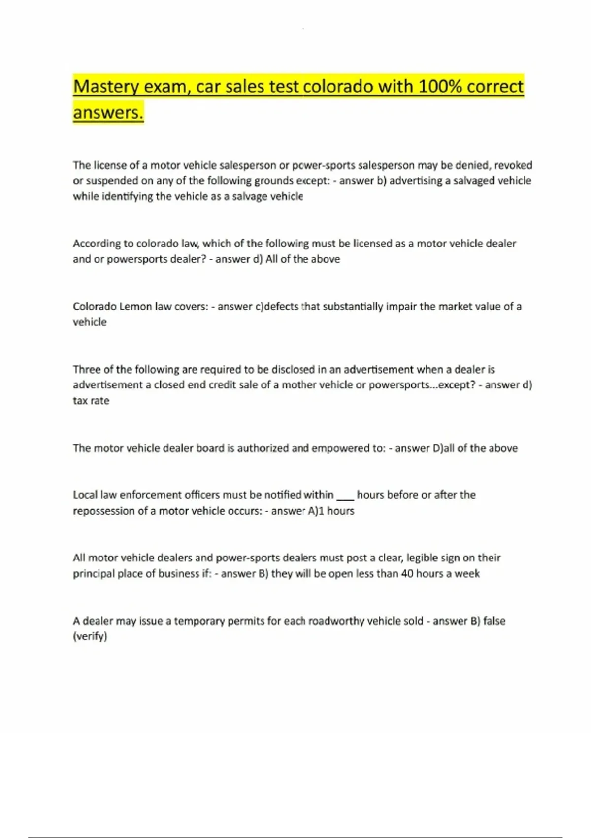 Mastery exam, car sales test colorado with 100% correct answers.Mastery exam, car sales test colorado with 100% correct answers.