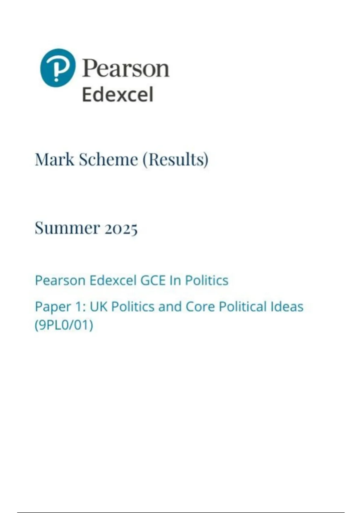 Pearson Edexcel GCE In Politics Paper 1: UK Politics and Core Political Ideas (9PLO/01) marking scheme June 2025