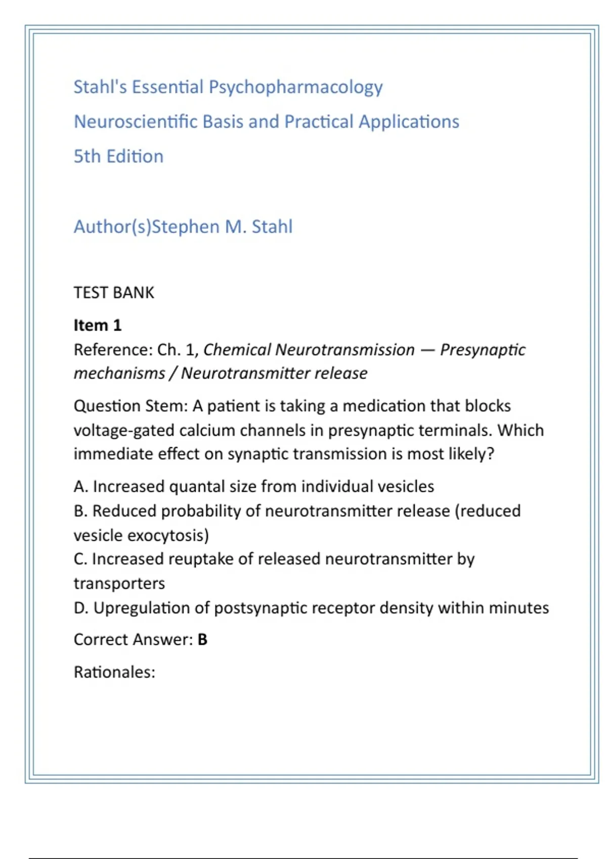 Stahl’s Essential Psychopharmacology 5th Edition Test Bank | 100% Verified NCLEX & HESI-Style Questions with Answers & Rationales Compelling SEO Description (≈200 words) Ace your exams with the official-style Test Bank for Stahl’s Essential Psychopharmacology: Neuroscientific Basis and Practical Applications, 5th Edition by Stephen M. Stahl. This comprehensive resource is designed specifically for nursing students, medical students, and healthcare professionals preparing for certification and clinical success. Each chapter includes 20 NCLEX/HESI-style multiple-choice questions that mirror real exam formats, ensuring you practice the way you will be tested. Every question is paired with a verified correct answer and step-by-step rationale, helping you understand not just what is correct, but why. Aligned directly with the 5th edition textbook, this test bank covers all major chapters, from the foundations of chemical neurotransmission to advanced psychopharmacology applications. Whether you are preparing for NCLEX, HESI, medical board exams, or advanced nursing coursework, this test bank offers guaranteed pass support by strengthening critical thinking and clinical decision-making skills. With clear explanations, practical clinical scenarios, and certification-ready content, this test bank ensures you are not only exam-prepared but also practice-ready. Boost your confidence, save study time, and achieve your academic and professional goals with this complete exam-prep solution. Trending SEO Hashtags #NCLEXPrep #HESIReview #Psychopharmacology #NursingSchool #MedicalStudents #ExamSuccess #StudyResources #CertificationReady #TestBankSolutions #PharmacologyReview Keyword List (8–12 keywords) Stahl’s Essential Psychopharmacology 5th Edition test bank NCLEX style questions psychopharmacology HESI style exam prep nursing Verified test bank with rationales Nursing pharmacology exam questions Stahl test bank download Medical student exam review Certification ready study guide Nursing school pharmacology test bank Stahl 5th edition question bank Pass NCLEX guaranteed support Clinical psychopharmacology practice questions