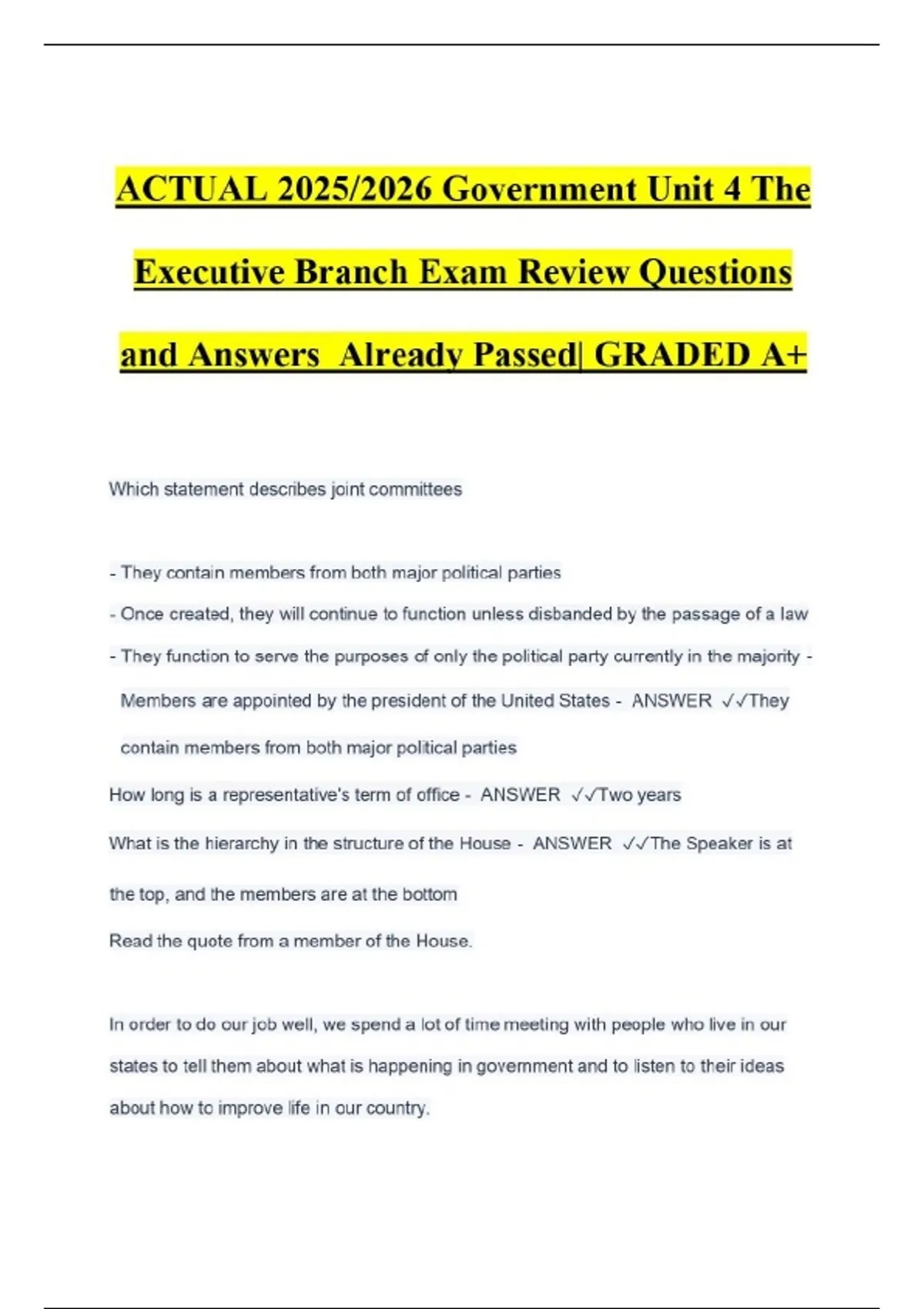 ACTUAL 2025/2026 Government Unit 4 The Executive Branch Exam Review Questions and Answers Already Passed| GRADED A+