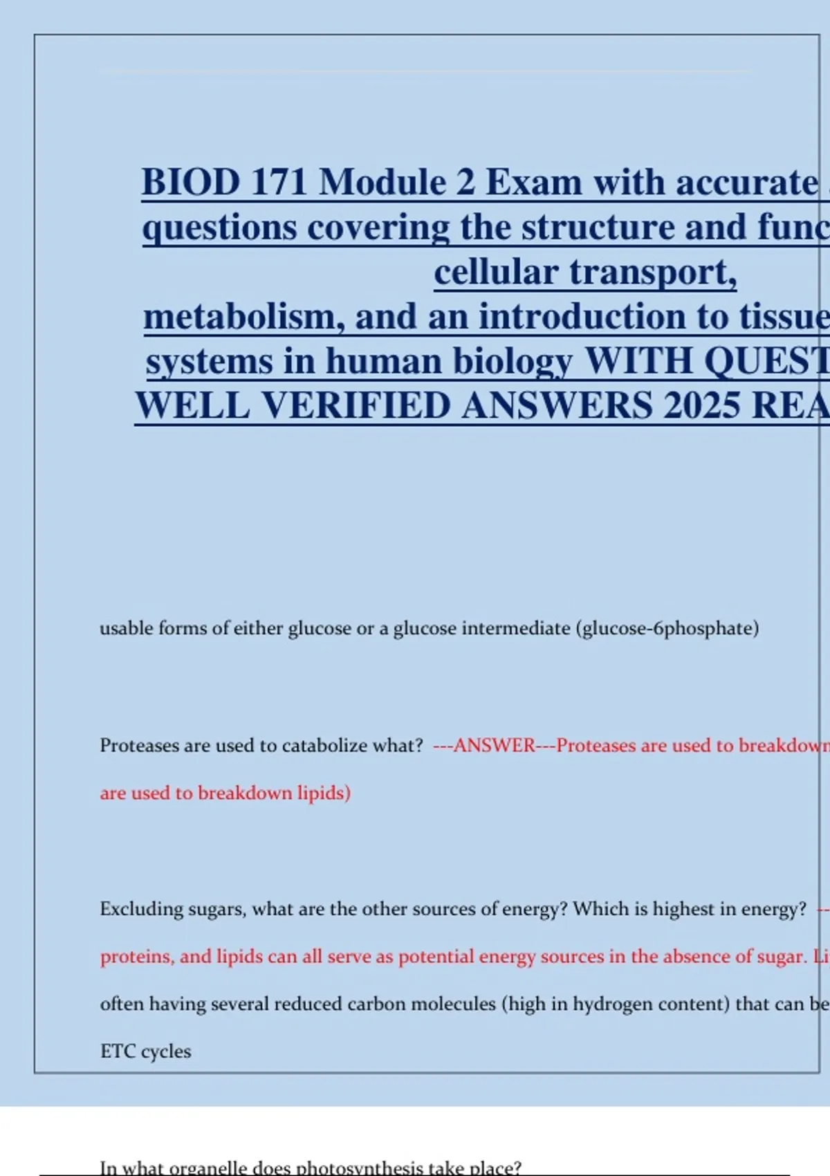 Prepare for the BIOD 171 Module 2 Exam (Portage Learning, 2025) with this study guide. Covers cell structure, cellular transport, metabolism, and an introduction to tissues and organ systems. Includes practice-style questions with answers.