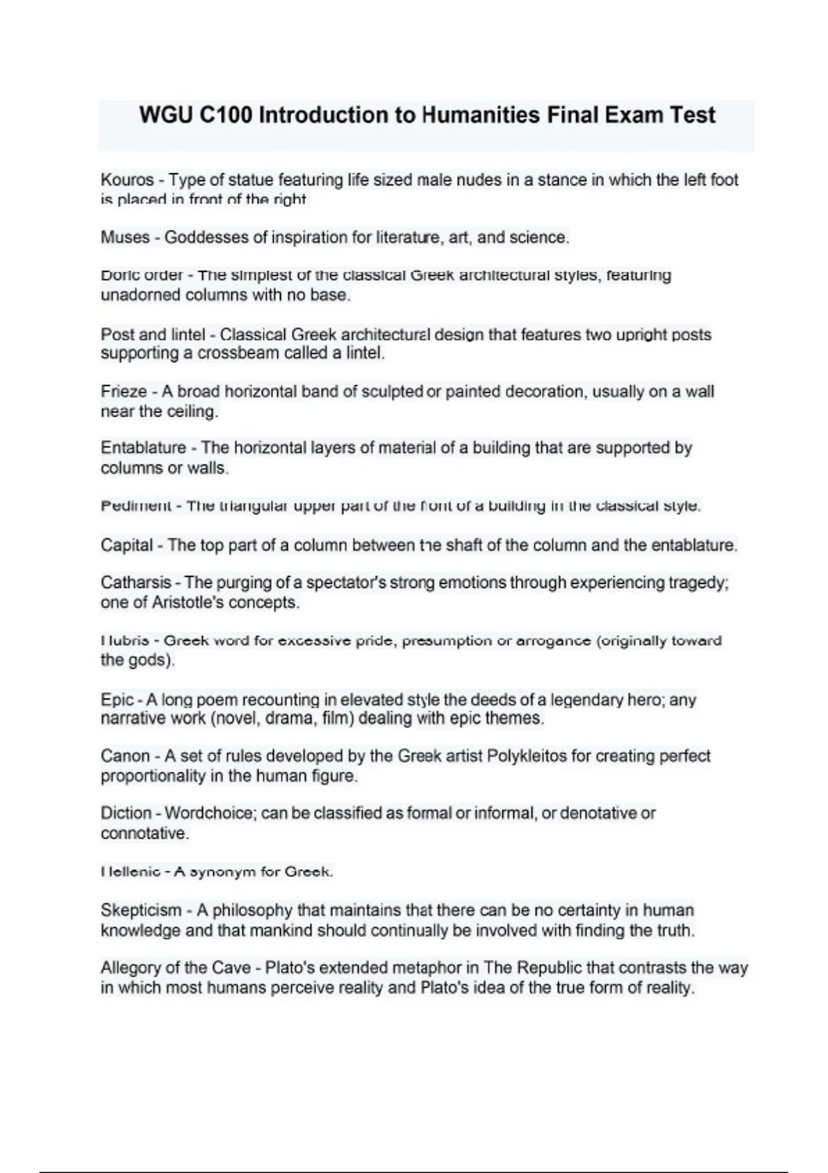 Kouros - Type of statue featuring life sized male nudes in a stance in which the left foot is placed in front of the right. Muses - Goddesses of inspiration for literature, art, and science. Doric order - The simplest of the classical Greek architectural styles, featuring unadorned columns with no base. Post and lintel - Classical Greek architectural design that features two upright posts supporting a crossbeam called a lintel. Frieze - A broad horizontal band of sculpted or painted decoration, usually on a wall near the ceiling. Entablature - The horizontal layers of material of a building that are supported by columns or walls. Pediment - The triangular upper part of the front of a building in the classical style. Capital - The top part of a column between the shaft of the column and the entablature. Catharsis - The purging of a spectator's strong emotions through experiencing tragedy; one of Aristotle's concepts. Hubris - Greek word for excessive pride, presumption or arrogance (originally toward the gods). Epic - A long poem recounting in elevated style the deeds of a legendary hero; any narrative work (novel, drama, film) dealing with epic themes. Canon - A set of rules developed by the Greek artist Polykleitos for creating perfect proportionality in the human figure. Diction - Wordchoice; can be classified as formal or informal, or denotative or connotative. Hellenic - A synonym for Greek. Skepticism - A philosophy that maintains that there can be no certainty in human knowledge and that mankind should continually be involved with finding the truth. Allegory of the Cave - Plato's extended metaphor in The Republic that contrasts the way in which most humans perceive reality and Plato's idea of the true form of reality. WGU C100 Introduction to Humanities Final Exam Test The Forms - Plato's concept that there are ideal essences (the Forms) of objects or things. Philosopher King - A hypothetical ruler, or Guardian, of Plato's ideal city state. Golden Mean - Aristotle's term for the desirable middle between two extremes, between excess and inadequacy. Lyre - A string instrument like a U shaped harp known for its use by the classical Greeks. Humanism - The study of the creative and intellectual contributions of all human cultures. Polytheism - The belief in multiple gods; religion based on more than one god. Classicism - Aesthetic attitudes and principles found in the art, architecture, and literature of ancient Greece and Rome. Democracy - Government of direct rule by the people, a form developed by the Greeks. Republic - Government where supreme power rests in the body of citizens entitled to vote and is exercised by representatives chosen directly or indirectly. Socratic Method - Analytical method of reasoning developed by Greek philosopher Socrates that asks a progression of questions in pursuit of the truth. linear perspective - The creation of the illusion of depth based on the fact that parallel lines or edges appear to converge, and objects appear smaller as the distance between them and a viewer increases. Protestant Reformation - A religious movement of the 16th century to reform the Roman Catholic Church that resulted in the creation of Protestant churches. chiaroscuro - The creation of the illusion of depth through gradations of light and shade. dialect - A form of language which is particular to a group of people, such as those belonging to a region or social class Silk Road - An overland route from Constantinople to Beijing used in the trade of silks and spices between Europe and the Far East; it was eventually blocked by the Ottoman Empire and travel by sea became more popular. classical humanism - The cultural movement of the Renaissance, based on Greek and Roman classic literature, that emphasized the dignity, worth, and rationality of humankind. madrigal - A polyphonic vocal work, usually written for four or five voices, setting a pastoral poem to music, performed without instrumental accompaniment, and intended for secular use. Reformation art - Art movement of the 16th century, largely in Northern Europe, that reflected religious views of Protestant Reformation. iconoclasm - The deliberate destruction of religious art, imagery, icons, and other symbols or monuments. In Praise of Folly - A satirical essay written by Desiderius Erasmus () in which he criticizes the abuses and corruption of Catholic doctrine in parts of the Catholic Church. balance - The achievement of putting different areas of the body in dynamic tension with one another. symmetry - The pleasing or harmonious proportionate arrangement of corresponding parts of an artwork. humanism - The study of the creative and intellectual contributions of all human cultures. self- fashioning - The process of fashioning one's individual sense of self and public persona according to a set of socially acceptable standards. The Prince - A political treatise written by Niccolò Machiavelli () in which he claims that the ends justify the means and that those with political power should use whatever advantage they have to keep it and control the populace. individualism - That which separates one unique person from another, as well as the social and philosophical viewpoint that celebrates that difference. Renaissance Man - A term describing an individual with broad knowledge and versatile talents spanning many intellectual and artistic disciplines. epistemology - The study of thinking. Age of Exploration - Time period between the early fifteenth to the early seventeenth centuries when Europeans sailed around the globe and transferred goods, food, plants, and people (in the form of slaves) transforming the countries they reached.