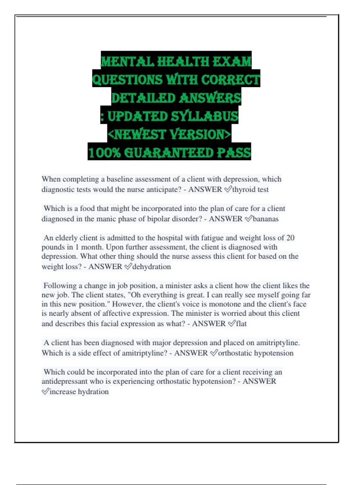 Mental Health Exam Questions with correct Detailed answers : updated syllabus Newest version 100% guaranteed pass When completing a baseline assessment of a client with depression, which diagnostic tests would the nurse anticipate? - ANSWER thyroid test Which is a food that might be incorporated into the plan of care for a client diagnosed in the manic phase of bipolar disorder? - ANSWER bananas An elderly client is admitted to the hospital with fatigue and weight loss of 20 pounds in 1 month. Upon further assessment, the client is diagnosed with depression. What other thing should the nurse assess this client for based on the weight loss? - ANSWER dehydration Following a change in job position, a minister asks a client how the client likes the new job. The client states, "Oh everything is great. I can really see myself going far in this new position." However, the client's voice is monotone and the client's face is nearly absent of affective expression. The minister is worried about this client and describes this facial expression as what? - ANSWER flat A client has been diagnosed with major depression and placed on amitriptyline. Which is a side effect of amitriptyline? - ANSWER orthostatic hypotension Which could be incorporated into the plan of care for a client receiving an antidepressant who is experiencing orthostatic hypotension? - ANSWER increase hydration A client was admitted to the psychiatric unit with major depression after a suicide attempt. In addition to the client's feelings of sadness and hopelessness, the nurse would expect to assess what? - ANSWER Psychomotor retardation Psychodynamic theory attributes the development of mood disorders to what? - ANSWER Unexpressed and unconscious anger The parent of a suicidal adolescent is concerned that "only crazy people commit suicide." When helping the parent understand a daughter's suicidal behavior, the nurse would explain what? - ANSWER Analysis of suicide notes reveals that most people who commit suicide are extremely unhappy The nurse is assessing a client with depression and a colleague suggests that the client be encouraged to sign a no-suicide contract. What is the nurse's best response to the colleague.. - ANSWER There's no demonstrated benefit of no-suicide contracts, though they're not believed to be harmful." A client is diagnosed with panic disorder. When considering the neurochemical theory of the disorder, which would the nurse expect to administer as the drug of choice initially? - ANSWER SSRI A biologic theory explains anxiety disorders in which way? - ANSWER Based in genetics with clinical symptoms being a result of chromosomal influence A group of students is reviewing information about anxiety disorders in preparation for a class examination. The students demonstrate understanding of the material when they state what? - ANSWER Women experience anxiety disorders more often than do men A client diagnosed with panic disorder has been receiving medication therapy, which is being discontinued. A nurse would be alert for possible withdrawal symptoms if the client was receiving what? - ANSWER lorazepam A nurse is preparing a plan of care for a client with anxiety. Which elements would the nurse likely include? Select all that apply. - ANSWER Using appropriate coping skills; Identifying treatment modalities; Involving family for support, if appropriate; Providing supportive feedback Which client is most likely to be at risk for drug dependence and difficulties with withdrawal? - ANSWER taking lorazepam
