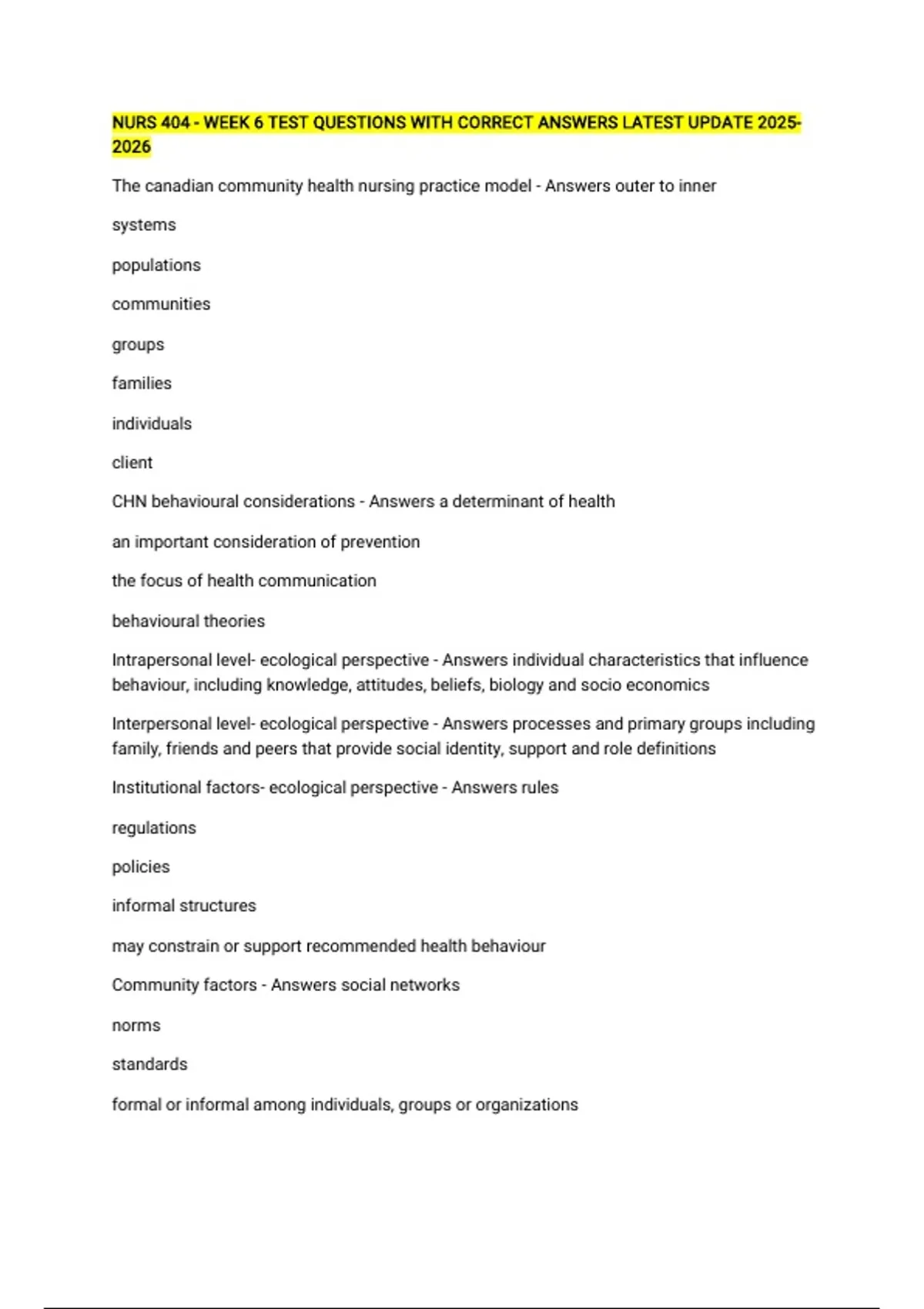 NURS 404 - WEEK 6 TEST QUESTIONS WITH CORRECT ANSWERS LATEST UPDATE