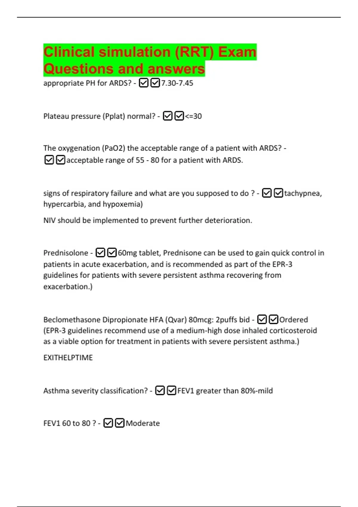 Clinical simulation (RRT) Exam Questions and answers appropriate PH for ARDS? - 7.30-7.45 Plateau pressure (Pplat) normal? - <=30 The oxygenation (PaO2) the acceptable range of a patient with ARDS? - acceptable range of 55 - 80 for a patient with ARDS. signs of respiratory failure and what are you supposed to do ? - tachypnea, hypercarbia, and hypoxemia) NIV should be implemented to prevent further deterioration.