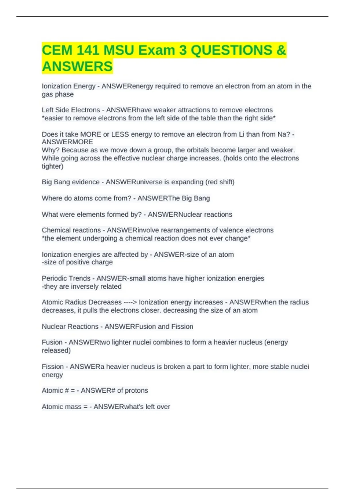CEM 141 MSU Exam 3 QUESTIONS & ANSWERS