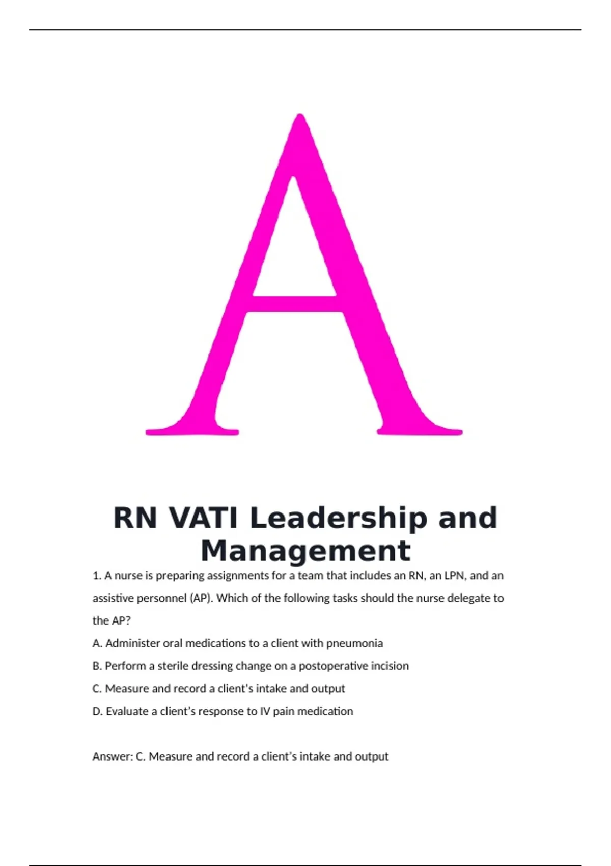 Answer: C. Measure and record a client’s intake and output
