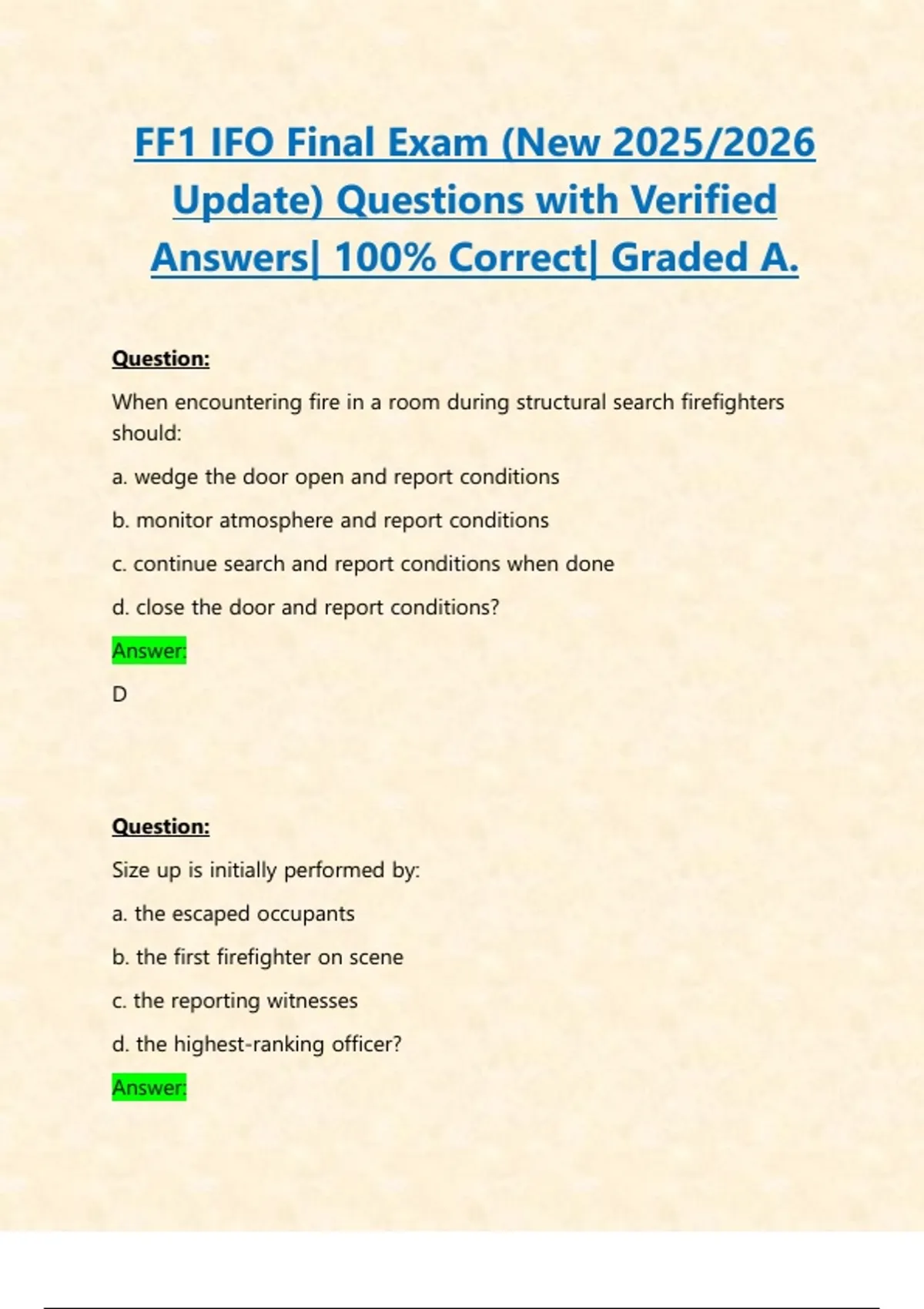 FF1 IFO Final Exam (New 2025/2026 Update) Questions with Verified Answers| 100% Correct| Graded A. FF1 IFO Final Exam (New 2025/2026 Update) Questions with Verified Answers| 100% Correct| Graded A.