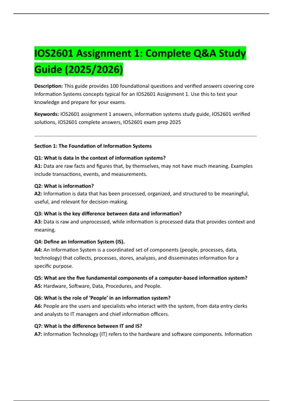 Keywords: IOS2601 assignment 1 answers, information systems study guide, IOS2601 verified