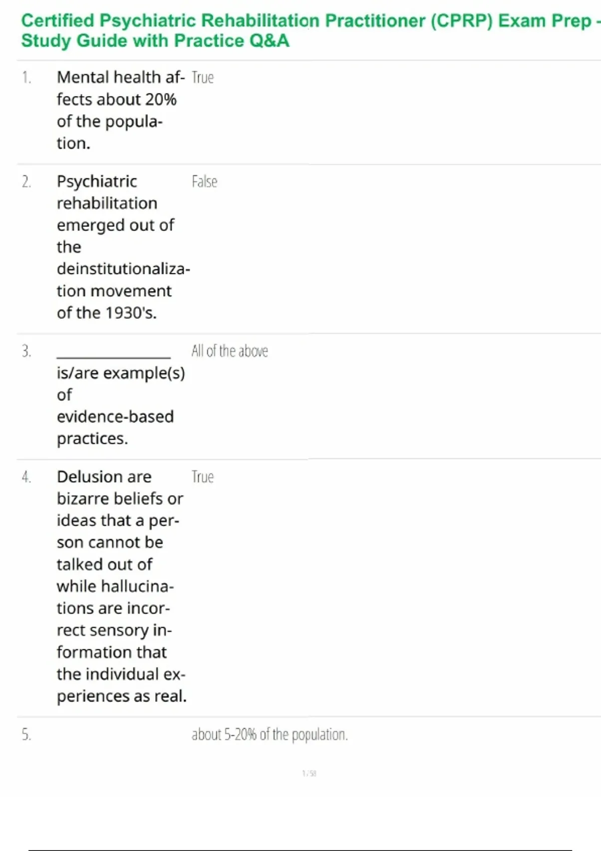 Comprehensive prep resource for the Certified Psychiatric Rehabilitation Practitioner (CPRP) exam. Includes study notes and practice questions with answers to help candidates review essential psychiatric rehabilitation concepts and build confidence for certification success.