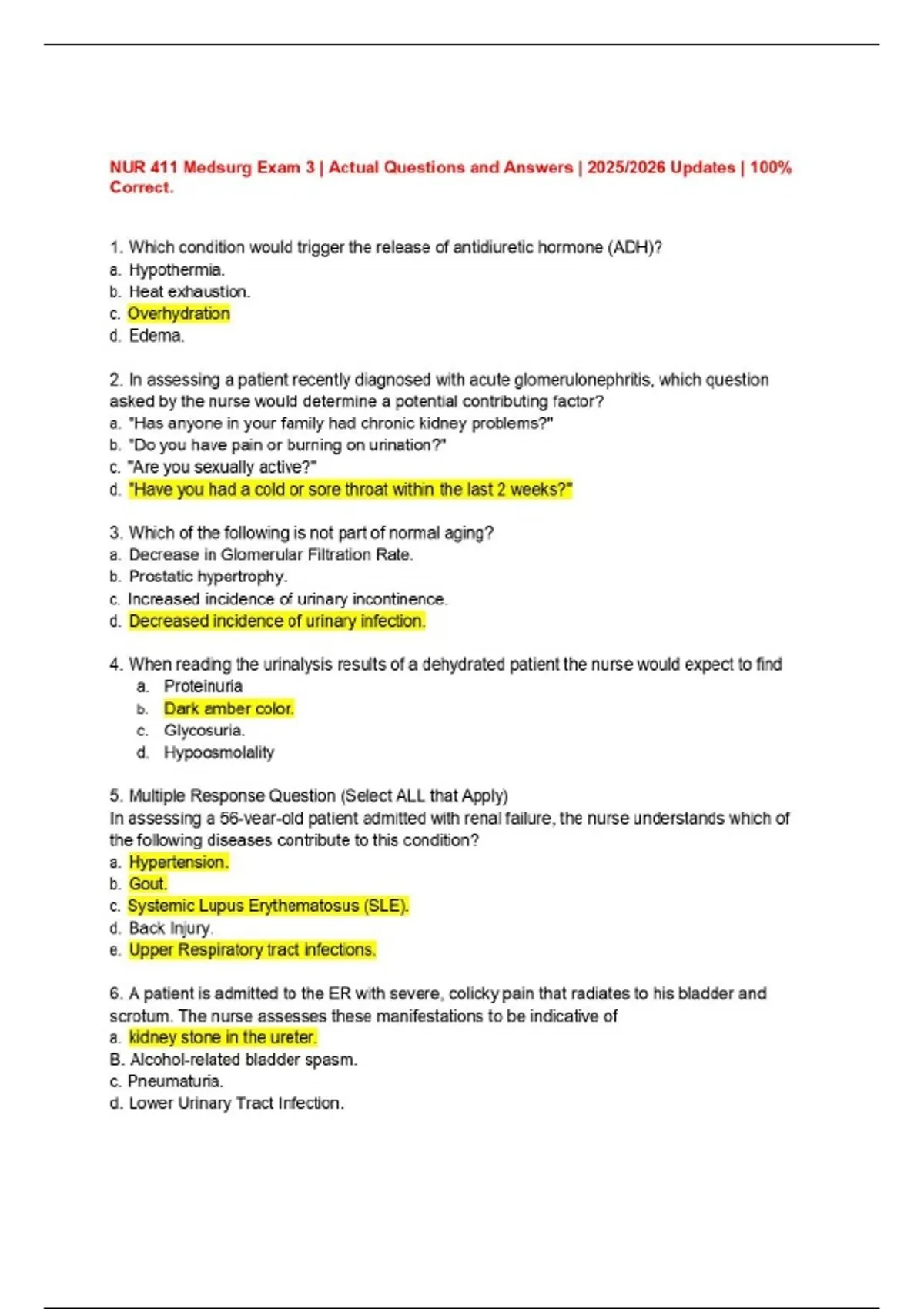 NUR 411 Medsurg Exam 3 | Actual Questions and Answers | 2025/2026 Updates | 100% Correct.