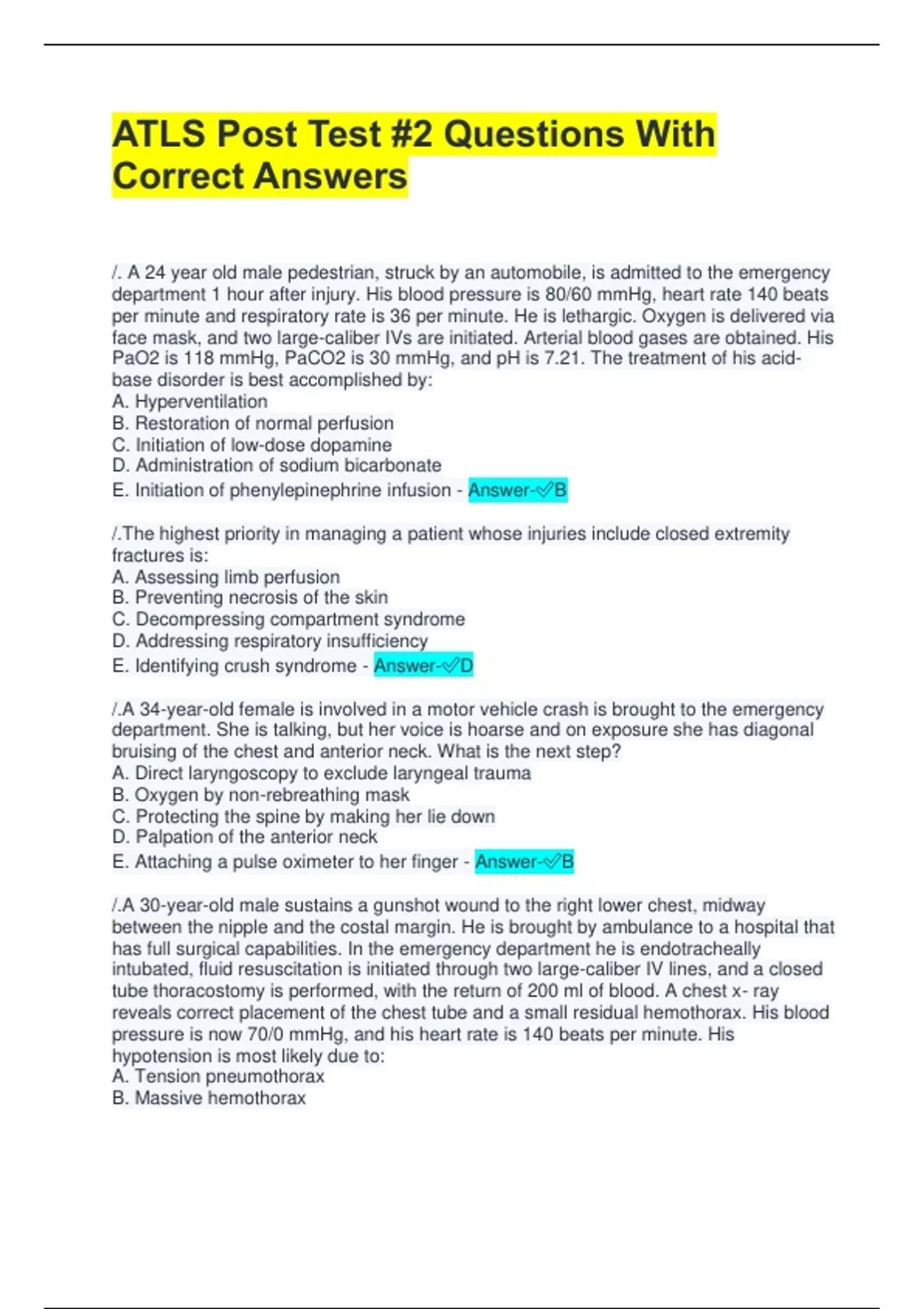 ATLS Post Test #2 Questions With Correct Answers /. A 24 year old male pedestrian, struck by an automobile, is admitted to the emergency department 1 hour after injury. His blood pressure is 80/60 mmHg, heart rate 140 beats per minute and respiratory rate is 36 per minute. He is lethargic. Oxygen is delivered via face mask, and two large-caliber IVs are initiated. Arterial blood gases are obtained. His PaO2 is 118 mmHg, PaCO2 is 30 mmHg, and pH is 7.21. The treatment of his acid-base disorder is best accomplished by: A. Hyperventilation B. Restoration of normal perfusion C. Initiation of low-dose dopamine D. Administration of sodium bicarbonate E. Initiation of phenylepinephrine infusion - Answer-B /.The highest priority in managing a patient whose injuries include closed extremity fractures is: A. Assessing limb perfusion B. Preventing necrosis of the skin C. Decompressing compartment syndrome D. Addressing respiratory insufficiency E. Identifying crush syndrome - Answer-D /.A 34-year-old female is involved in a motor vehicle crash is brought to the emergency department. She is talking, but her voice is hoarse and on exposure she has diagonal bruising of the chest and anterior neck. What is the next step? A. Direct laryngoscopy to exclude laryngeal trauma B. Oxygen by non-rebreathing mask C. Protecting the spine by making her lie down D. Palpation of the anterior neck E. Attaching a pulse oximeter to her finger - Answer-B /.A 30-year-old male sustains a gunshot wound to the right lower chest, midway between the nipple and the costal margin. He is brought by ambulance to a hospital that has full surgical capabilities. In the emergency department he is endotracheally intubated, fluid resuscitation is initiated through two large-caliber IV lines, and a closed tube thoracostomy is performed, with the return of 200 ml of blood. A chest x- ray reveals correct placement of the chest tube and a small residual hemothorax. His blood pressure is now 70/0 mmHg, and his heart rate is 140 beats per minute. His hypotension is most likely due to: A. Tension pneumothorax B. Massive hemothorax C. Pericardial tamponade D. Intraabdominal bleeding E. Insufficient isotonic crystalloid infusion - Answer-D /.A 20-year-old athlete is involved in a motorcycle crash after having ridden for hours on a very hot day. When he arrives in the emergency department, he shouts that he cannot move his legs. On physical examination, there are no abnormalities of the chest, abdomen, or pelvis. The patient has no sensation in his legs and cannot move them, but his arms are moving. The patient's respiratory rate is 22, heart rate is 88, and blood pressure is 80/60 mmHg. He is pale and sweaty. What is the most likely cause of his hypotension? A. Neurogenic shock B. Cardiac tamponade C. Myocardial contusion D. Hyperthermia E. Hemorrhagic shock - Answer-E /.Compared with adults, children have: A. A longer, wider, funnel-shaped airway B. A less pliable, calcified skeleton C. Greater mobility of mediastinal structures D. A relatively smaller head and larger jaw E. Anterior displacement of C5 on C6 - Answer-C /.Which one of the findings below requires a definitive airway in trauma patients? A. Facial lacerations B. Repeated vomiting C. Partial thickness facial burns, cough, and hoarseness D. Sternal fracture E. Glasgow Coma Scale score of 12 - Answer-C /.In a patient with spinal cord injury, sacral sparing: A. Refers to a fracture of the sacrum B. Is part of the spinal shock syndrome C. Is a good prognostic sign D. Indicates a complete spinal cord injury E. Occurs only with complete transection of the lumbosacral spinal cord - Answer-C /.A 22-year-old woman falls while skiing. She is evaluated at a small community hospital that does not have neurological services. Spinal motion is restricted, supplemental oxygen by mask is administered, and two antecubital IVs are placed. Her Glascow Coma Scale score is 12, pupils are equal, blood pressure is 135/76 mmHg, heart rate is 105, and respiratory rate is 19. Chest x-ray is normal. This patient's management priorities are: A. Repeat primary survey and transfer to a trauma center B. Definitive airway, CT of the head, and intracranial pressure monitor