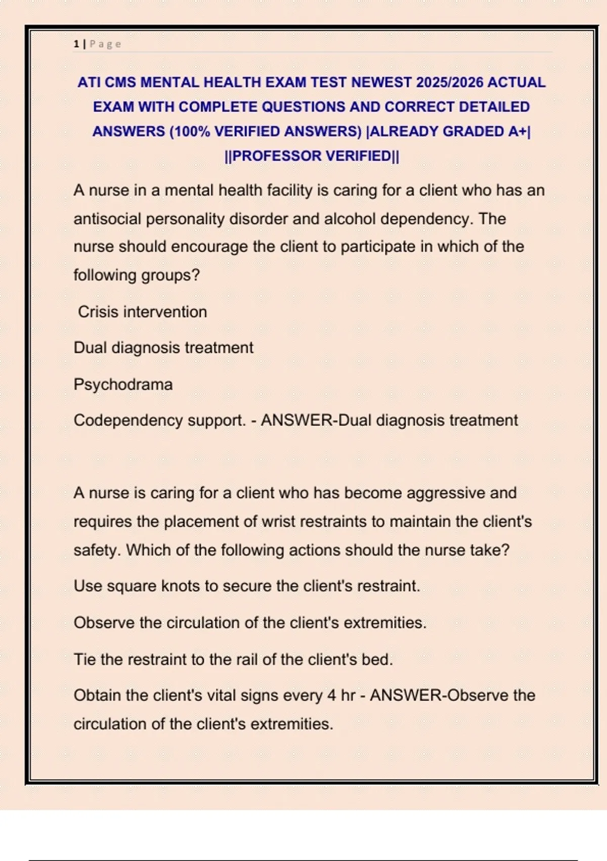 ATI CMS MENTAL HEALTH EXAM TEST NEWEST 2025/2026 ACTUAL EXAM WITH COMPLETE QUESTIONS AND CORRECT DETAILED ANSWERS (100% VERIFIED ANSWERS) |ALREADY GRADED A+| ||PROFESSOR VERIFIED||