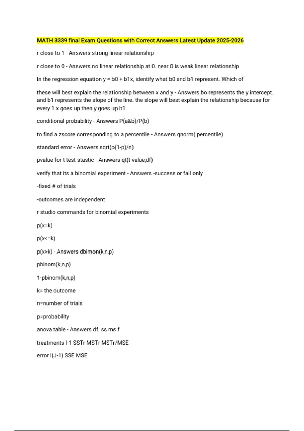 MATH 3339 final Exam Questions with Correct Answers Latest Update r close to 1 - Answers strong linear relationship r close to 0 - Answers no linear relationship at 0. near 0 is weak linear relationship In the regression equation y = b0 + b1x, identify what b0 and b1 represent. Which of these will best explain the relationship between x and y - Answers bo represents the y intercept. and b1 represents the slope of the line. the slope will best explain the relationship because for every 1 x goes up then y goes up b1. conditional probability - Answers P(a&b)/P(b) to find a zscore corresponding to a percentile - Answers qnorm(.percentile) standard error - Answers sqrt(p(1-p)/n) pvalue for t test stastic - Answers qt(t value,df) verify that its a binomial experiment - Answers -success or fail only -fixed # of trials -outcomes are independent r studio commands for binomial experiments p(x=k) p(x<=k) p(x>k) - Answers dbimon(k,n,p) pbinom(k,n,p) 1-pbinom(k,n,p) k= the outcome n=number of trials p=probability anova table - Answers df. ss ms f treatments I-1 SSTr MSTr MSTr/MSE error I(J-1) SSE MSE total IJ-1 SST MSTr - Answers SSTr/(I-1)