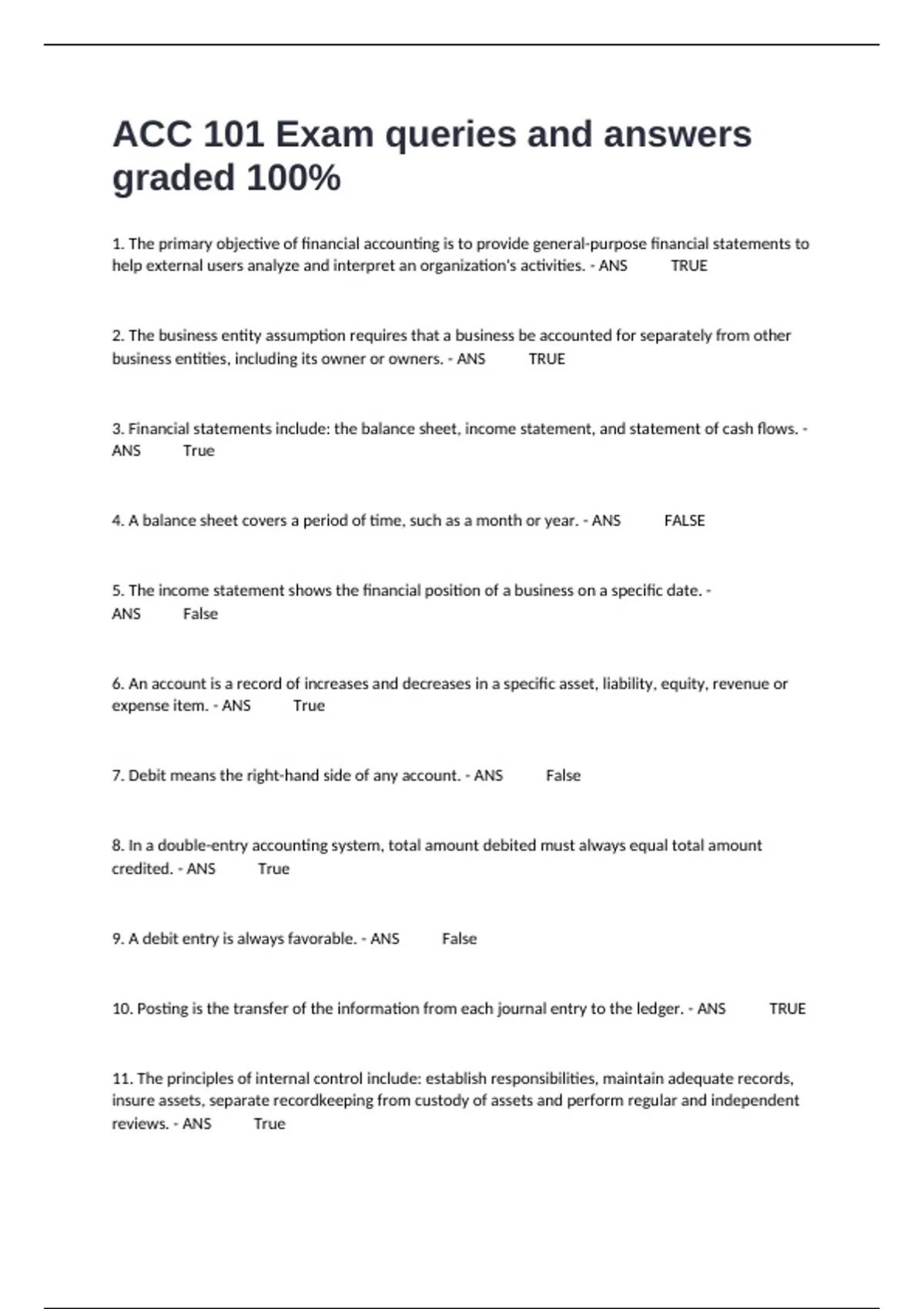 ACC 101 Exam queries and answers graded 100