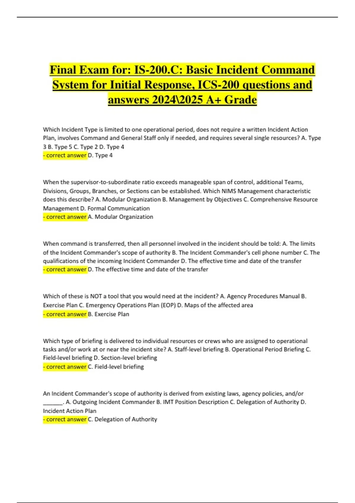 FEMA IS-200.C Basic Incident Command System for Initial Response Final Exam | Verified Questions and Answers | A+ Grade 2024/2025,This document provides the final exam for FEMA IS-200.C: Basic Incident Command System for Initial Response, featuring verified questions with correct answers. It covers ICS fundamentals, command staff roles, incident action planning, resource management, and coordination during initial response. Updated for 2024/2025 and already graded A+, this resource ensures reliable preparation and successful course completion.
