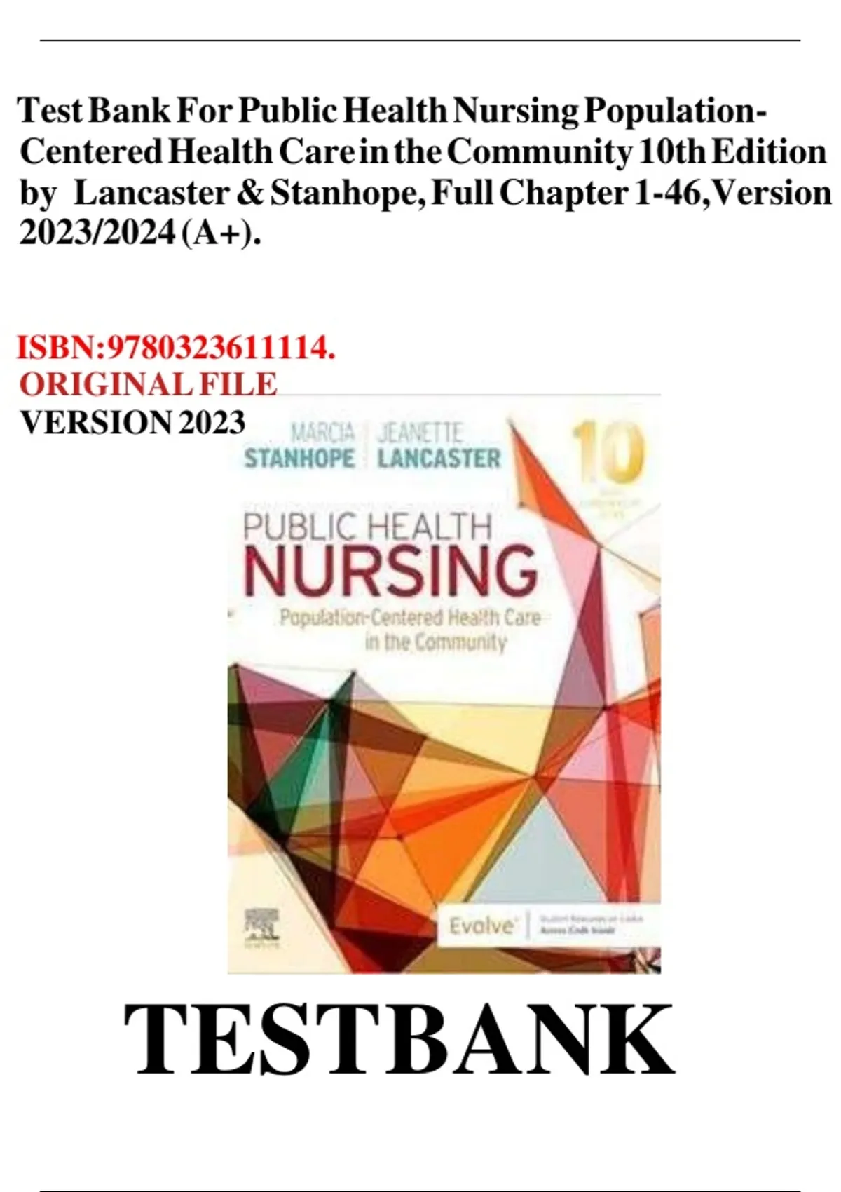 Test Bank Complete_ Public Health Nursing: Population-Centered Health Care In The Community 11th Edition, (2024) By Marcia Stanhope & Jeanette Lancaster| All Chapter 1-20| Latest Version With Well Detailed And Verified Answers| Grade A+
